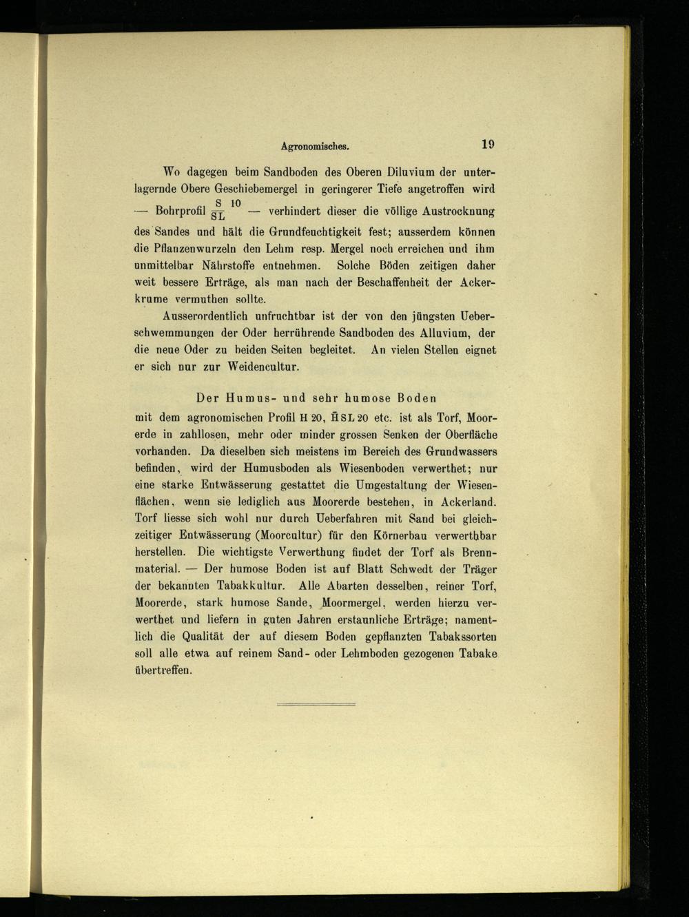 mit dem agronomischen Profil H 20, HSL20 etc. ist als Torf, Moorerde in zahllosen, mehr oder minder grossen Senken der Oberfläche vorhanden. Da dieselben sich meistens im Bereich des Grundwassers befinden, wird der Humusboden als Wiesenboden verwerthet; nur eine starke Entwässerung gestattet die Umgestaltung der Wiesenflächen, wenn sie lediglich aus Moorerde bestehen, in Ackerland. Torf liesse sich wohl nur durch Ueberfahren mit Sand bei gleichzeitiger Entwässerung(Moorcultur) für den Körnerbau verwerthbar herstellen. Die wichtigste Verwerthung findet der Torf als Brennmaterial.— Der humose Boden ist auf Blatt Schwedt der Träger der bekannten Tabakkultur. Alle Abarten desselben, reiner Torf, Moorerde, stark humose Sande, Moormergel, werden hierzu verwerthet und liefern in guten Jahren erstaunliche Erträge; namentlich die Qualität der auf diesem Boden gepflanzten Tabakssorten soll alle etwa auf reinem Sand- oder Lehmboden gezogenen Tabake übertreffen.