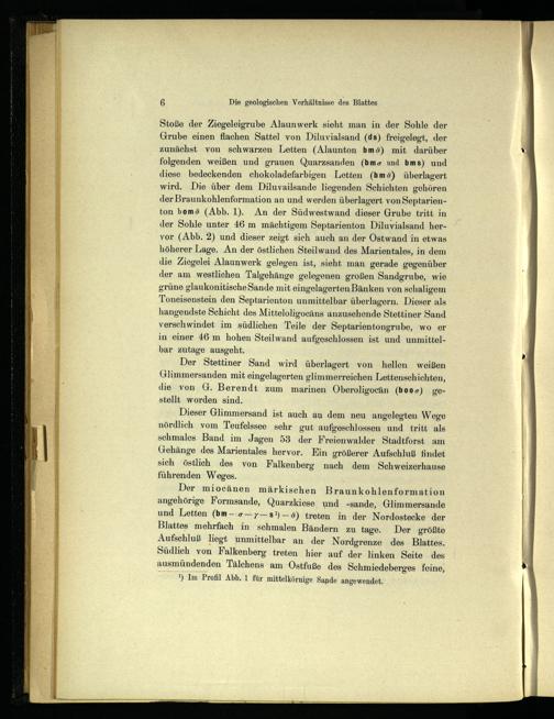Der miocänen märkischen Braunkohlenformation angehörige Formsande, Quarzkiese und-sande, Glimmersande und Letten(bm-—.o—7—8')—%) treten in der Nordostecke der Blattes mehrfach in schmalen Bändern zu tage. Der größte Aufschluß liegt unmittelbar an der Nordgrenze des Blattes. Südlich von Falkenberg treten hier auf der linken Seite des ausmündenden Tälchens am Ostfuße des Schmiedeberges feine; z!) Im Profil Abb. 1 für mittelkörnige Sande angewendet.