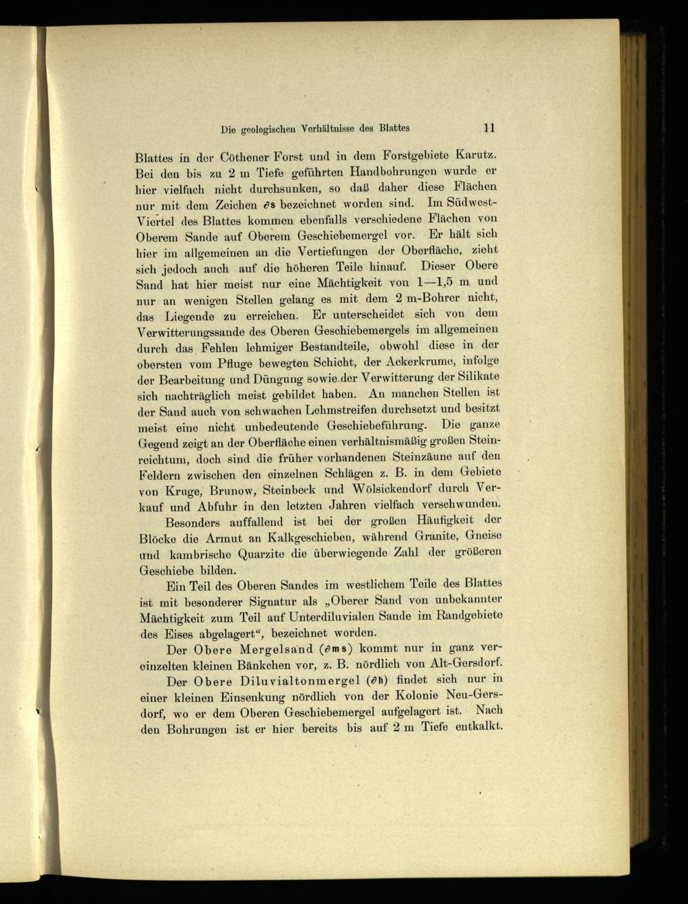Blattes in der Cöthener Forst und in dem Forstgebiete Karutz. Bei den bis zu 2 m Tiefe geführten Handbohrungen wurde er hier vielfach nicht durchsunken, so daß daher diese Flächen nur mit dem Zeichen 6s bezeichnet worden sind. Im SüdwestViertel des Blattes kommen ebenfalls verschiedene Flächen von Oberem Sande auf Oberem Geschiebemergel vor. Er hält sich hier im allgemeinen an die Vertiefungen der Oberfläche, zieht sich jedoch auch auf die höheren Teile hinauf. Dieser Obere Sand hat hier meist nur eine Mächtigkeit von 1—1,5 m und nur an wenigen Stellen gelang es mit dem 2 m-Bohrer nicht, das Liegende zu erreichen. KEr unterscheidet sich von dem Verwitterungssande des Oberen Geschiebemergels im allgemeinen durch das Fehlen lehmiger Bestandteile, obwohl diese in der obersten vom Pfluge bewegten Schicht, der Ackerkrume, infolge der Bearbeitung und Düngung sowie.der Verwitterung der Silikate sich nachträglich meist gebildet haben. An manchen Stellen ist der Sand auch von schwachen Lehmstreifen durchsetzt und besitzt meist eine nicht unbedeutende Geschiebeführung. Die ganze Gegend zeigt an der Oberfläche einen verhältnismäßig großen Steinreichtum, doch sind die früher vorhandenen Steinzäune auf den Feldern zwischen den einzelnen Schlägen z. B. in dem Gebiete von Kruge , Brunow , Steinbeck und Wölsickendorf durch Verkauf und Abfuhr in den letzten Jahren vielfach verschwunden.