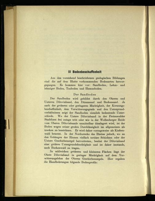 Der Sandboden wird gebildet durch den Oberen und Unteren Diluvialsand, den Dünensand und Beckensand. Je nach der größeren oder geringeren Mächtigkeit, der Körnungsbeschaffenheit, dem Verwitterungsgrade und den Untergrundverhältnissen zeigt der Sandboden ziemlich bedeutende Unterschiede. Wo der Untere Diluvialsand in der Freienwalder Stadtforst frei zutage tritt oder wie in der Wollenberger Heide vom Oberen Diluvialsande unmittelbar überlagert wird, ist der Boden wegen seiner großen Durchlässigkeit im allgemeinen als trocken zu bezeichnen. Er wird daher vorzugsweise als Kiefernwald benutzt. In der Nordostecke des Blattes jedoch, wo an den Gehängen der Rinnen vielfach tertiäre Schichten oder der Untere Geschiebemergel hervortreten, besitzt der Diluvialsand eine größere Untergrundsfeuchtigkeit und ist daher imstande, auch Buchenwald zu tragen.