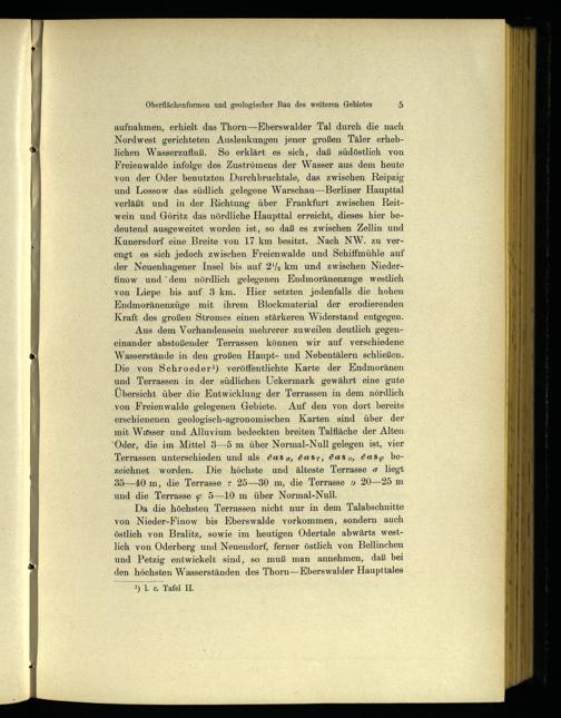 Aus dem Vorhandensein mehrerer zuweilen deutlich gegeneinander abstoßender Terrassen können wir auf verschiedene Wasserstände in den großen Haupt- und Nebentälern schließen. Die von Schroeder!) veröffentlichte Karte der Endmoränen und Terrassen in der südlichen Uckermark gewährt eine gute Übersicht über die Entwicklung der Terrassen in dem nördlich von Freienwalde gelegenen Gebiete. Auf den von dort bereits erschienenen geologisch-agronomischen Karten sind über der mit Wasser und Alluvium bedeckten breiten Talfläche der Alten Oder, die im Mittel 3—5 m über Normal-Null gelegen ist, vier Terrassen unterschieden und als dass, d0asTt, Öa8sı, das bezeichnet worden. Die höchste. und älteste Terrasse@ liegt 35—40 m, die Terrasse 7 25—30 m, die Terrasse v 20—25 m und die Terrasse# 5—10 m über Normal-Null.
