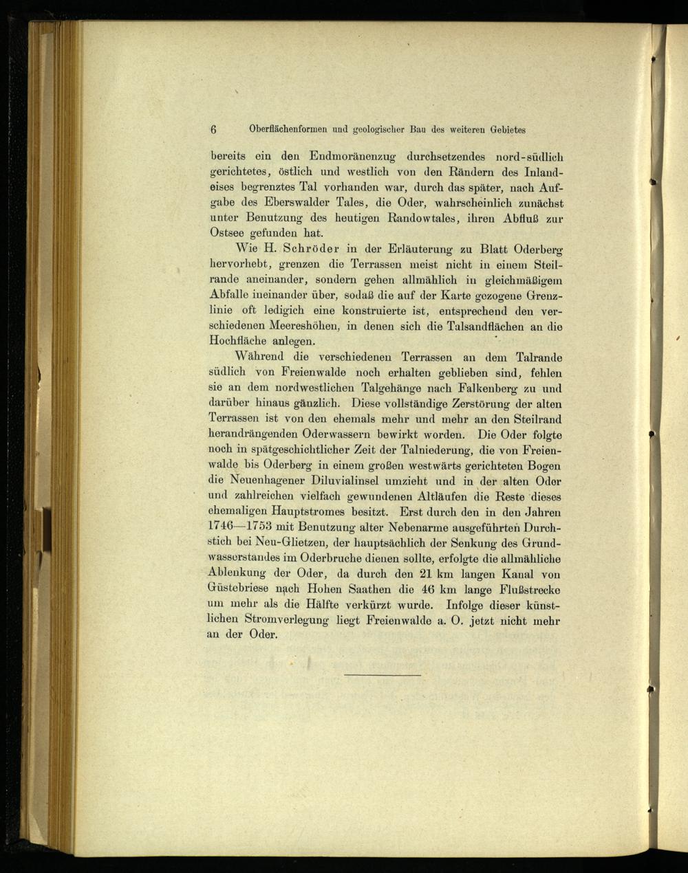 Während die verschiedenen Terrassen an dem Talrande südlich von Freienwalde noch erhalten geblieben sind, fehlen sie an dem nordwestlichen Talgehänge nach Falkenberg zu und darüber hinaus gänzlich. Diese vollständige Zerstörung der alten Terrassen ist von den ehemals mehr und mehr an den Steilrand herandrängenden Oderwassern bewirkt worden. Die Oder folgte noch in spätgeschichtlicher Zeit der Talniederung, die von Freien walde bis Oderberg in einem großen westwärts gerichteten Bogen die Neuenhagener Diluvialinsel umzieht und in der alten Oder und zahlreichen vielfach gewundenen Altläufen die Reste‘dieses ehemaligen Hauptstromes besitzt. Erst durch den in den Jahren 1746—1753 mit Benutzung alter Nebenarme ausgeführten Durchstich bei Neu-Glietzen, der hauptsächlich der Senkung des Grundwasserstandes im Oderbruche dienen sollte, erfolgte die allmähliche Ablenkung der Oder, da durch den 21 km langen Kanal von Güstebriese nach Hohen Saathen die 46 km lange Flußstrecke um mehr als die Hälfte verkürzt wurde. Infolge dieser künstlichen Stromverlegung liegt Freienwalde a. O. jetzt nicht mehr an der Oder.