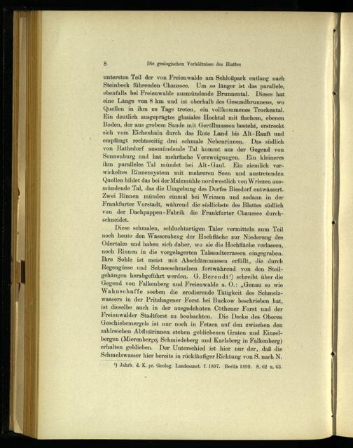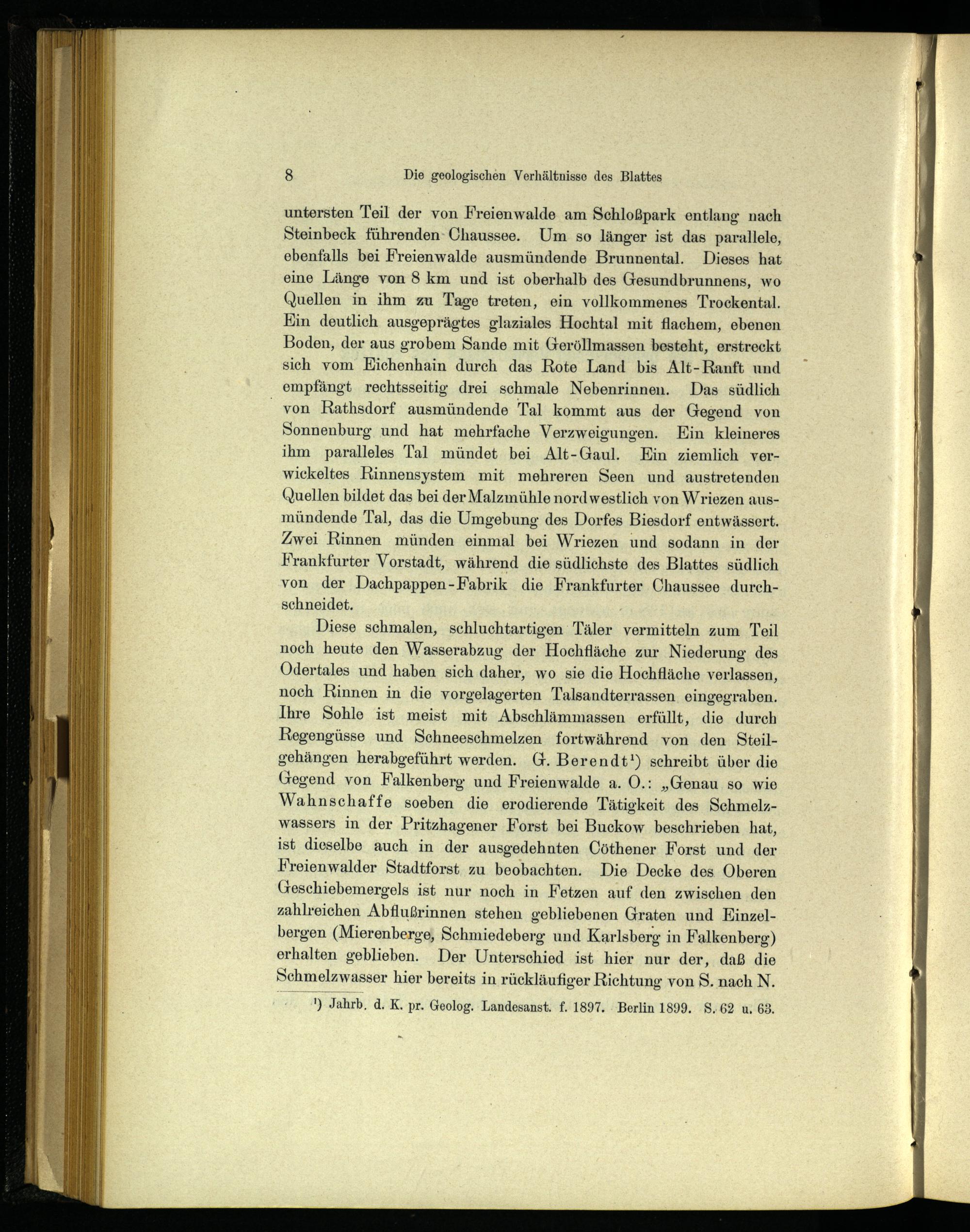 untersten Teil der von Freienwalde am Schloßpark entlang nach Steinbeck führenden- Chaussee. Um so länger ist das parallele, ebenfalls bei Freienwalde ausmündende Brunnental. Dieses hat eine Länge von 8 km und ist oberhalb des Gesundbrunnens, wo Quellen in ihm zu Tage treten, ein vollkommenes Trockental. Kin deutlich ausgeprägtes glaziales Hochtal mit flachem, ebenen Boden, der aus grobem Sande mit Geröllmassen besteht, erstreckt sich vom KEichenhain durch das Rote Land bis Alt-Ranft und empfängt rechtsseitig drei schmale Nebenrinnen. Das südlich von Rathsdorf ausmündende Tal kommt aus der Gegend von Sonnenburg und hat mehrfache Verzweigungen. Ein kleineres ihm paralleles Tal mündet bei Alt-Gaul. Ein ziemlich verwickeltes Rinnensystem mit mehreren Seen und austretenden Quellen bildet das bei der Malzmühle nord westlich von Wriezen ausmündende Tal, das die Umgebung des Dorfes Biesdorf entwässert. Zwei Rinnen münden einmal bei Wriezen und sodann in der Frankfurter Vorstadt, während die südlichste des Blattes südlich von der Dachpappen-Fabrik die Frankfurter Chaussee durchschneidet.