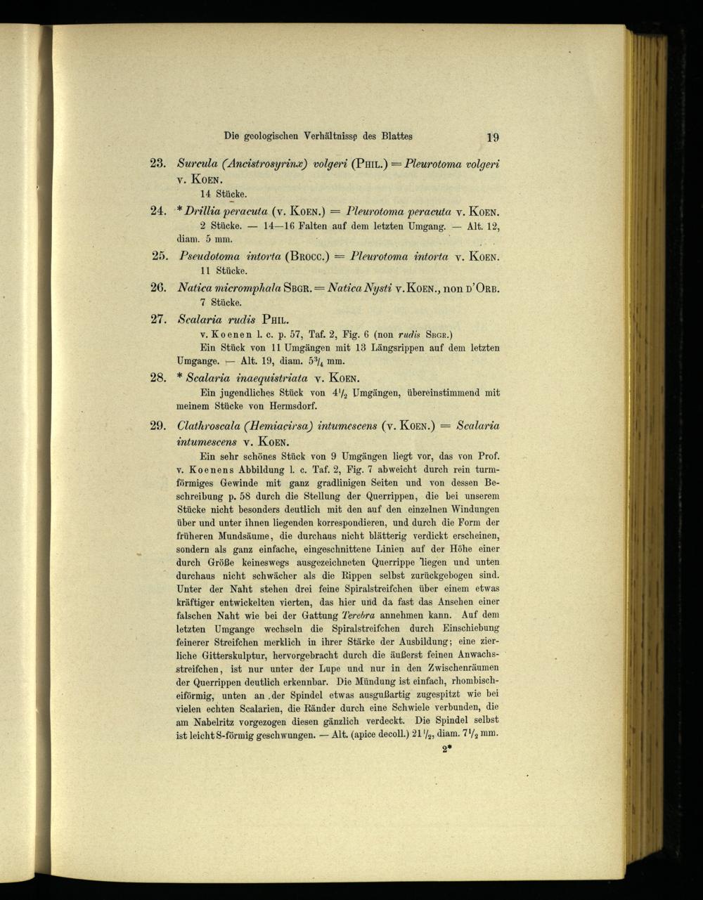 Ein sehr schönes Stück von 9 Umgängen liegt vor, das von Prof. v. Koenens Abbildung 1. c. Taf. 2, Fig. 7 abweicht durch rein turmförmiges Gewinde mit ganz gradlinigen Seiten und von dessen Beschreibung p. 58 durch die Stellung der Querrippen, die bei unserem Stücke nicht besonders deutlich mit den auf den einzelnen Windungen über und unter ihnen liegenden korrespondieren, und durch die Form der früheren Mundsäume, die durchaus nicht blätterig verdickt erscheinen, sondern als ganz einfache, eingeschnittene Linien auf der Höhe einer durch Größe keineswegs ausgezeichneten Querrippe liegen und unten durchaus nicht schwächer als die Rippen selbst zurückgebogen sind. Unter der Naht stehen drei feine Spiralstreifchen über einem etwas kräftiger entwickelten vierten, das hier und da fast das Ansehen einer falschen Naht wie bei der Gattung Zerebra annehmen kann. Auf dem letzten Umgange wechseln die Spiralstreifchen durch Einschiebung feinerer Streifchen merklich in ihrer Stärke der Ausbildung; eine zierliche Gitterskulptur, hervorgebracht durch die äußerst feinen Anwachsstreifchen, ist nur unter der Lupe und nur in den Zwischenräumen der Querrippen deutlich erkennbar. Die Mündung ist einfach, rhombischeiförmig, unten an.der Spindel etwas ausgußartig zugespitzt wie bei vielen echten Scalarien, die Ränder durch eine Schwiele verbunden, die am Nabelritz vorgezogen diesen gänzlich verdeckt. Die Spindel selbst ist leicht S-förmig geschwungen.— Alt.(apice decoll.) 21'/,, diam. 7!/, mm.