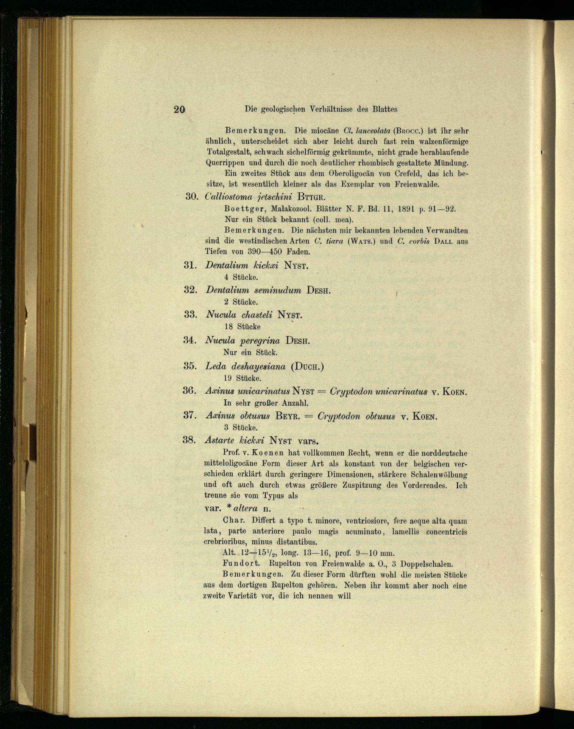 Prof. v. Koenen hat vollkommen Recht, wenn er die norddeutsche mitteloligocäne Form dieser Art als konstant von der belgischen verschieden erklärt durch geringere Dimensionen, stärkere Schalenwölbung und oft auch durch etwas größere Zuspitzung des Vorderendes. Ich trenne sie vom Typus als