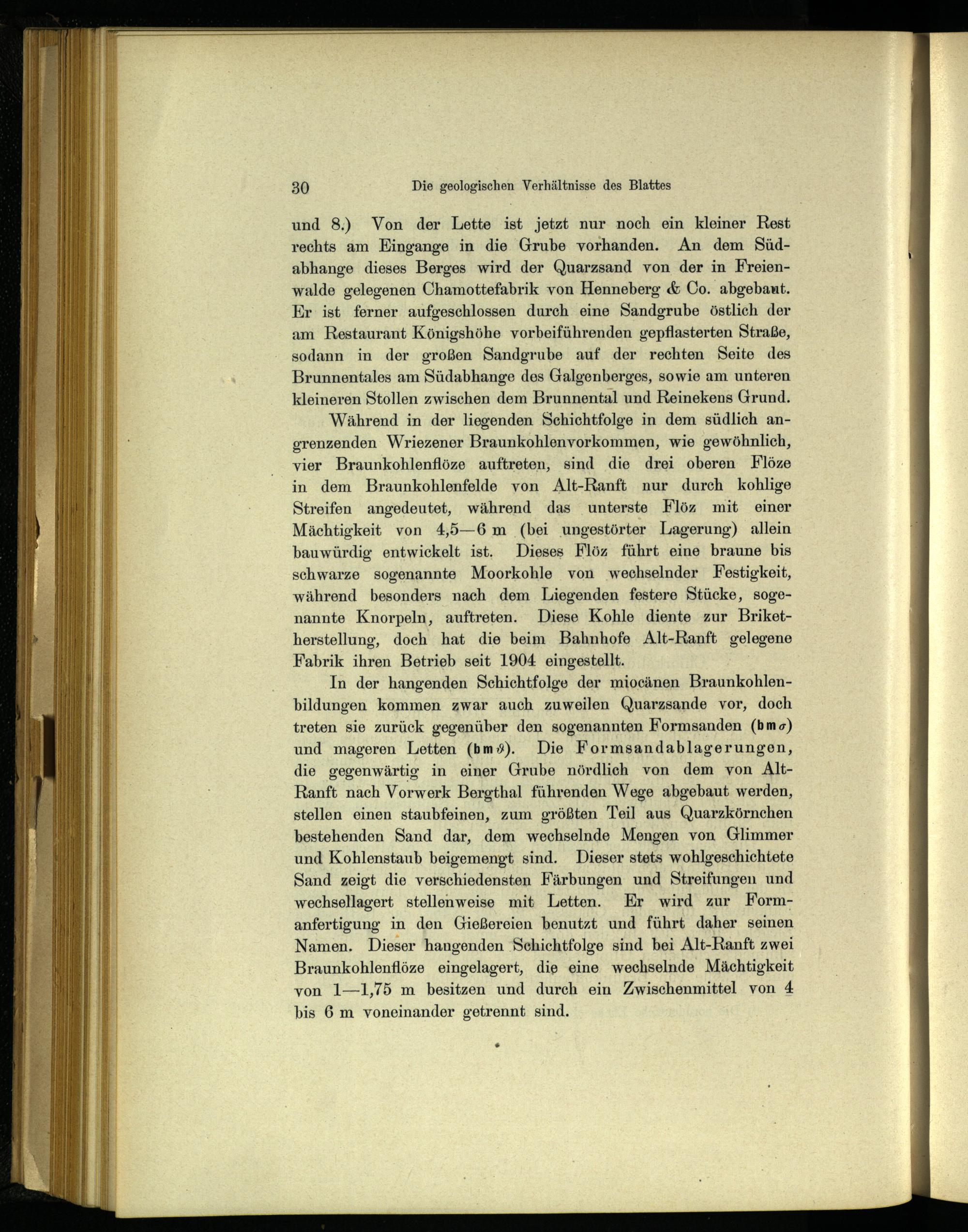 In der hangenden Schichtfolge der miocänen Braunkohlenbildungen kommen zwar auch zuweilen Quarzsande vor, doch treten sie zurück gegenüber den sogenannten Formsanden(bmo) und mageren Letten(bm%). Die Formsandablagerungen, die gegenwärtig in einer Grube nördlich von dem von AltRanft nach Vorwerk Bergthal führenden Wege abgebaut werden, stellen einen staubfeinen, zum größten Teil aus Quarzkörnchen bestehenden Sand dar, dem wechselnde Mengen von Glimmer und Kohlenstaub beigemengt sind. Dieser stets wohlgeschichtete Sand zeigt die verschiedensten Färbungen und Streifungen und wechsellagert stellenweise mit Letten. Er wird zur Formanfertigung in den Gießereien benutzt und führt daher seinen Namen. Dieser hangenden Schichtfolge sind bei Alt-Ranft zwei Braunkohlenflöze eingelagert, die eine wechselnde Mächtigkeit von 1—1,75 m besitzen und durch ein Zwischenmittel von 4 bis 6 m voneinander getrennt sind.