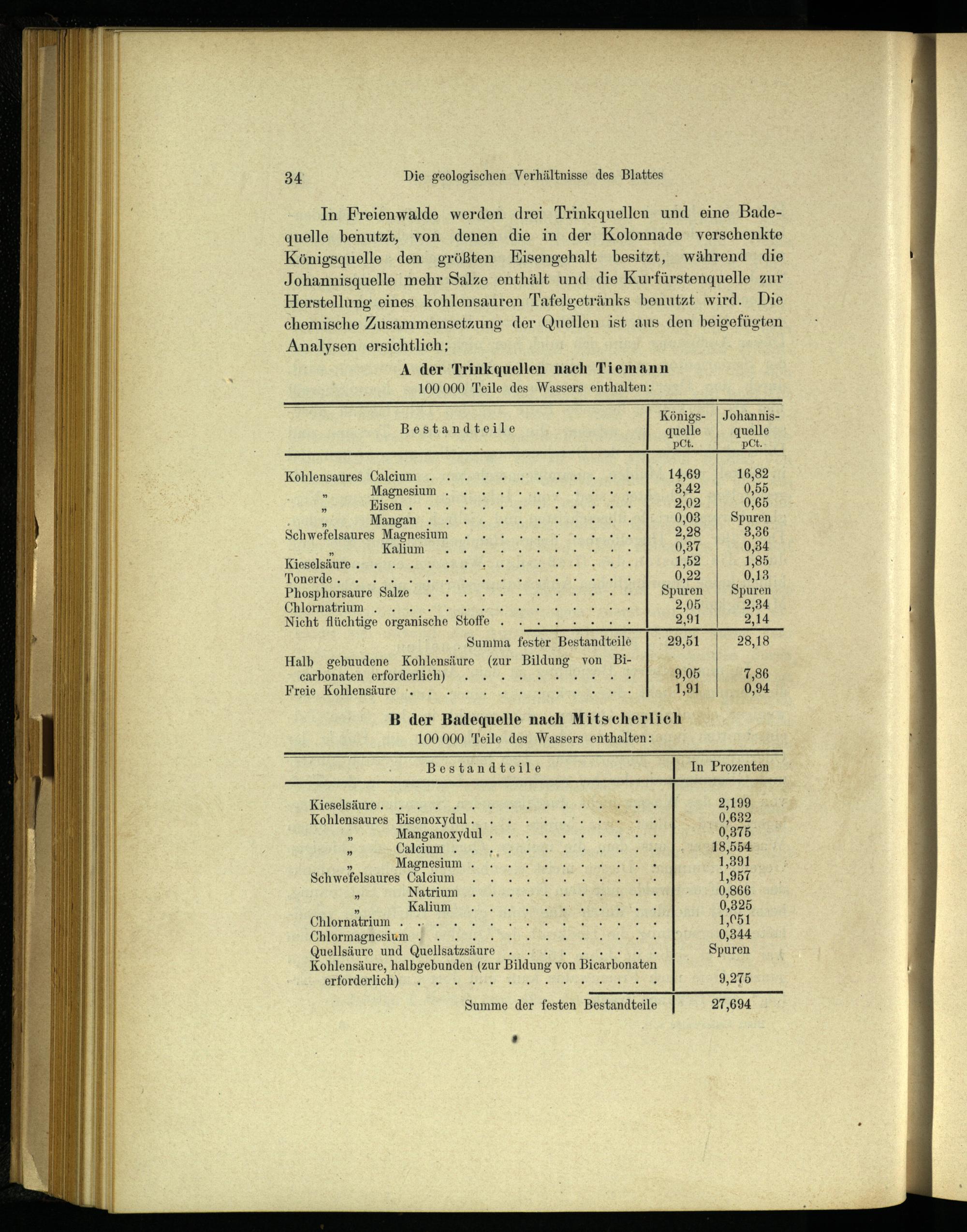 In Freienwalde werden drei Trinkquellen und eine Badequelle benutzt, von denen die in der Kolonnade verschenkte Königsquelle den größten Kisengehalt besitzt, während die Johannisquelle mehr Salze enthält und die Kurfürstenquelle zur Herstellung eines kohlensauren Tafelgetränks benutzt wird. Die chemische Zusammensetzung der Quellen ist aus den beigefügten Analysen ersichtlich;