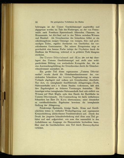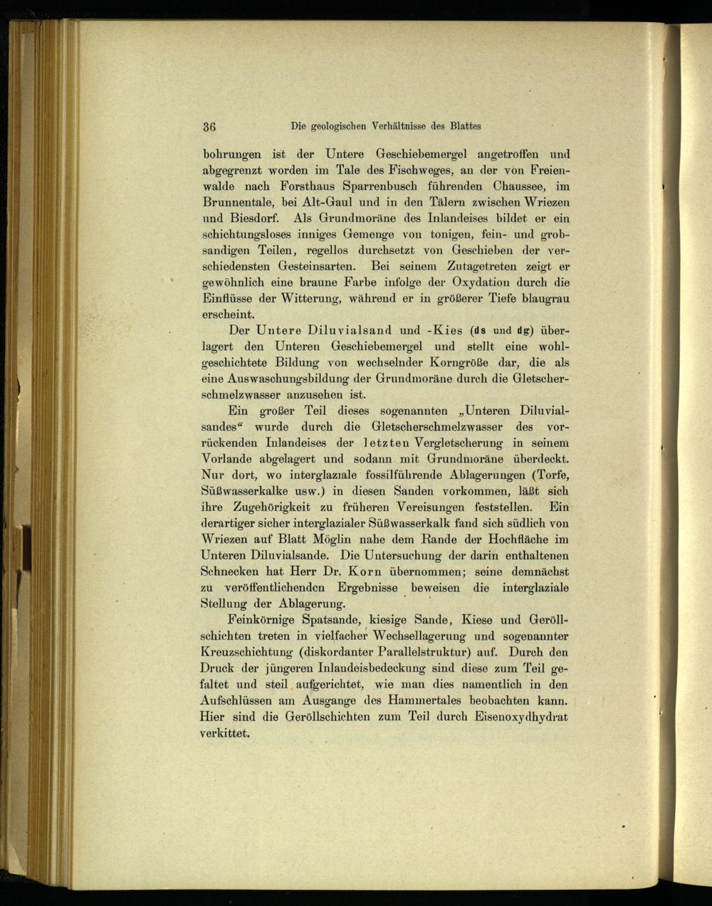 bohrungen ist der Untere Geschiebemergel angetroffen und abgegrenzt worden im Tale des Fischweges, an der von Freien walde nach Forsthaus Sparrenbusch führenden Chaussee, im Brunnentale, bei Alt-Gaul und in den Tälern zwischen Wriezen und Biesdorf . Als Grundmoräne des Inlandeises bildet er ein schichtungsloses inniges Gemenge von tonigen, fein- und grobsandigen Teilen, regellos durchsetzt von Geschieben der verschiedensten Gesteinsarten. Bei seinem Zutagetreten zeigt er gewöhnlich eine braune Farbe infolge der Oxydation durch die Einflüsse der Witterung, während er in größerer Tiefe blaugrau erscheint.