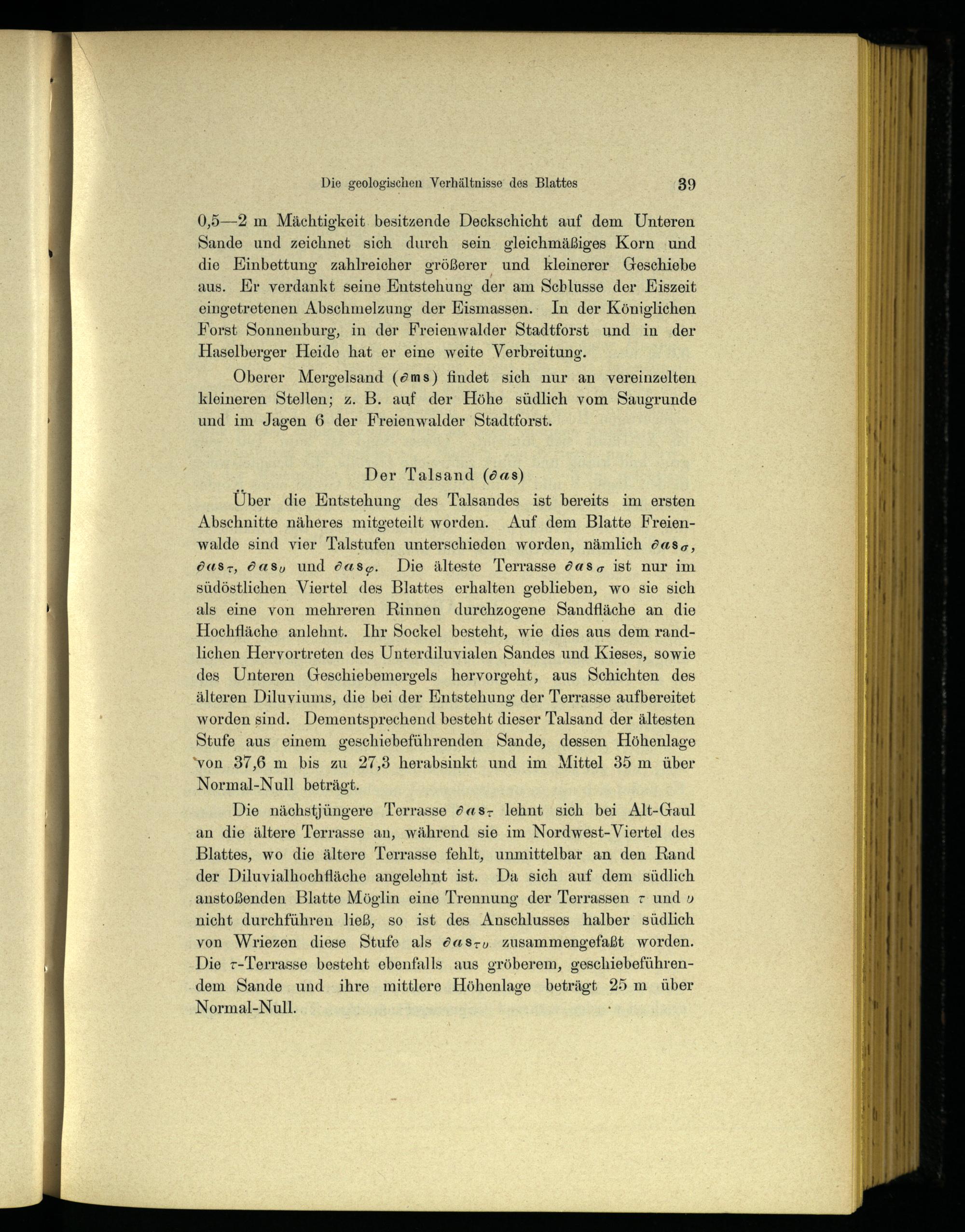 Über die Entstehung des Talsandes ist bereits im ersten Abschnitte näheres mitgeteilt worden. Auf dem Blatte Freien walde sind vier Talstufen unterschieden worden, nämlich 60asg, öu«S-, das und dasgy. Die älteste Terrasse das; ist nur im südöstlichen Viertel des Blattes erhalten geblieben, wo sie sich als eine von mehreren Rinnen durchzogene Sandfläche an die Hochfläche anlehnt. Ihr Sockel besteht, wie dies aus dem randlichen Hervortreten des Unterdiluvialen Sandes und Kieses, sowie des Unteren Geschiebemergels hervorgeht, aus Schichten des älteren Diluviums, die bei der Entstehung der Terrasse aufbereitet worden sind. Dementsprechend besteht dieser Talsand der ältesten Stufe aus einem geschiebeführenden Sande, dessen Höhenlage ‘von 37,6 m bis zu 27,3 herabsinkt und im Mittel 35 m über Normal-Null beträgt.
