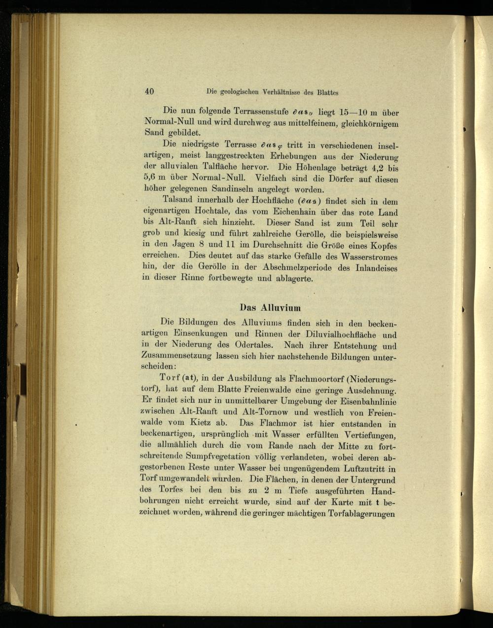 Torf(at), in der Ausbildung als Flachmoortorf(Niederungstorf), hat auf dem Blatte Freienwalde eine geringe Ausdehnung. Er findet sich nur in unmittelbarer Umgebung der Eisenbahnlinie zwischen Alt-Ranft und Alt-Tornow und westlich von Freien walde vom Kietz ab. Das Flachmor ist hier entstanden in beckenartigen, ursprünglich.mit Wasser erfüllten Vertiefungen, die allmählich durch die vom Rande nach der Mitte zu fortschreitende Sumpfvegetation völlig verlandeten, wobei deren abgestorbenen Reste unter Wasser bei ungenügendem Luftzutritt in Torf umgewandelt wurden. Die Flächen, in denen der Untergrund des Torfes bei den bis zu 2 m"Tiefe ausgeführten Handbohrungen nicht erreicht wurde, sind auf der Karte mit t bezeichnet worden, während die geringer mächtigen Torfablagerungen
