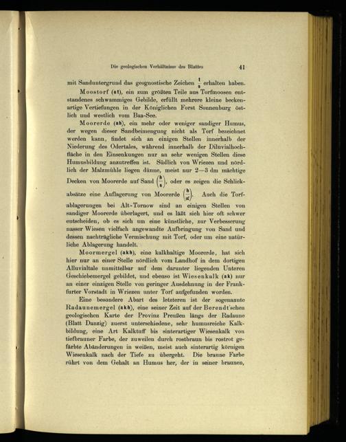 Eine besondere Abart des letzteren ist der sogenannte Radaunemergel(akh), eine seiner Zeit auf der Berendt’schen geologischen Karte der Provinz Preußen längs der Radaune (Blatt Danzig ) zuerst unterschiedene, sehr humusreiche Kalkbildung, eine Art Kalktuff bis sinterartiger Wiesenkalk von tiefbrauner Farbe, der zuweilen durch rostbraun bis rostrot gefärbte Abänderungen in weißen, meist auch sinterartig körnigen Wiesenkalk nach der Tiefe zu übergeht. Die braune Farbe rührt von dem Gehalt an Humus her, der in seiner braunen,