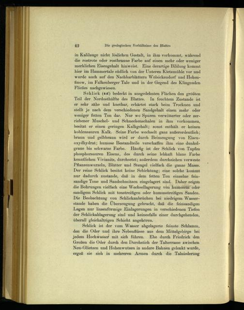 in Kalilauge nicht löslichen Gestalt, in ihm vorkommt,- während ‚die rostrote oder rostbraune Farbe auf einen mehr oder weniger merklichen Eisengehalt hinweist. Eine derartige Bildung kommt hier im Hammertale südlich von der Unteren Kietzmühle vor und wurde auch auf den Nachbarblättern Wölsickendorf und Hohen finow , im Falkenberger Tale und in der Gegend des Klingenden Fließes nachgewiesen.