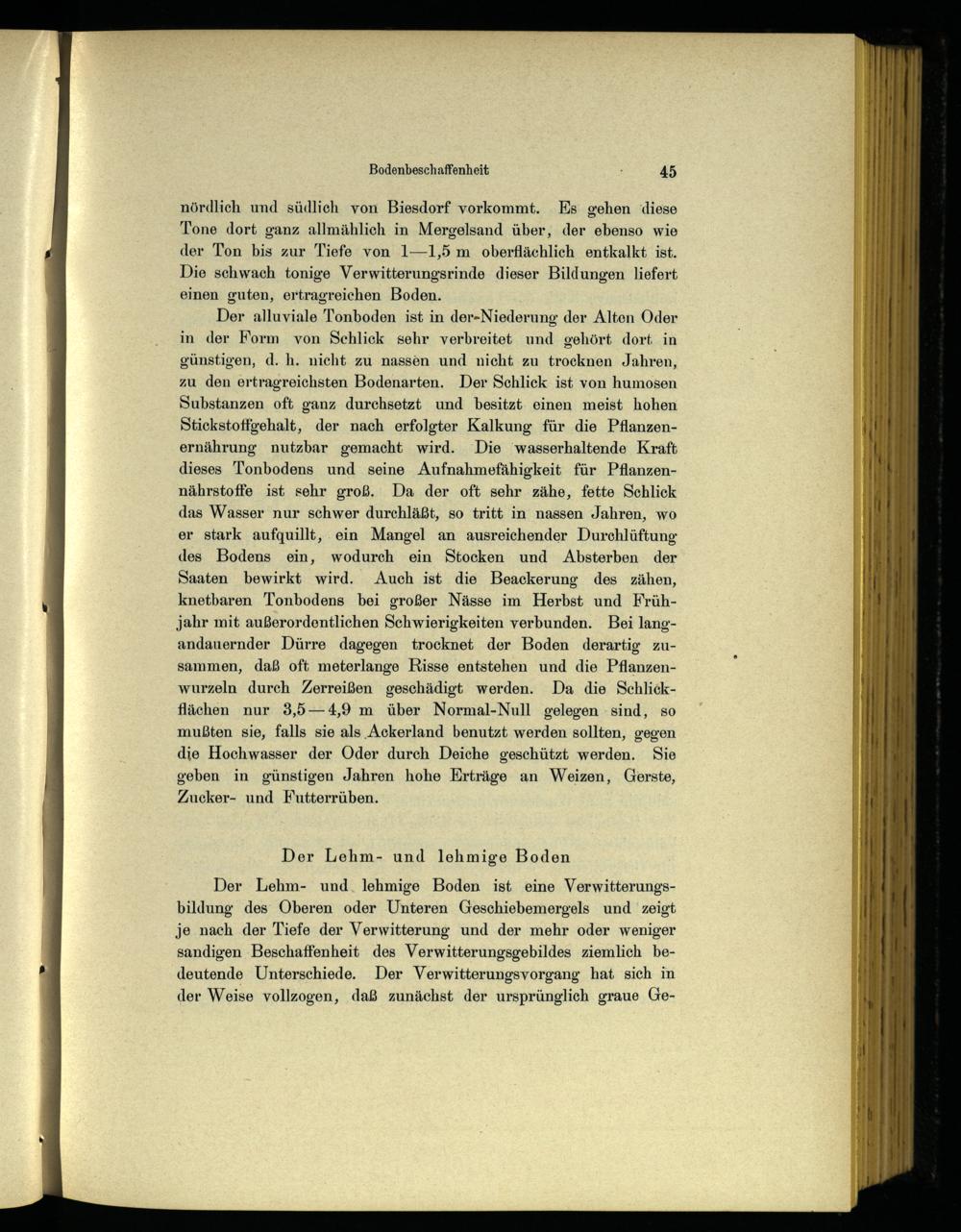 Der alluviale Tonboden ist in der-Niederung der Alten Oder in der Form von Schlick sehr verbreitet und gehört dort in günstigen, d. h. nicht zu nassen und nicht zu trocknen Jahren, zu den ertragreichsten Bodenarten. Der Schlick ist von humosen Substanzen oft ganz durchsetzt und besitzt einen meist hohen Stickstoffgehalt, der nach erfolgter Kalkung für die Pflanzenernährung nutzbar gemacht wird. Die wasserhaltende Kraft dieses Tonbodens und seine Aufnahmefähigkeit für Pflanzennährstoffe ist sehr groß. Da der oft sehr zähe, fette Schlick das Wasser nur schwer durchläßt, so tritt in nassen Jahren, wo er stark aufquillt, ein Mangel an ausreichender Durchlüftung des Bodens ein, wodurch ein Stocken und Absterben der Saaten bewirkt wird. Auch ist die Beackerung des zähen, knetbaren Tonbodens bei großer Nässe im Herbst und Frühjahr mit außerordentlichen Schwierigkeiten verbunden. Bei langandauernder Dürre dagegen trocknet der Boden derartig zusammen, daß oft meterlange Risse entstehen und die Pflanzenwurzeln durch Zerreißen geschädigt werden. Da die Schlickflächen nur 3,5—4,9 m über Normal-Null gelegen sind, so mußten sie, falls sie als Ackerland benutzt werden sollten, gegen die Hochwasser der Oder durch Deiche geschützt werden. Sie geben in günstigen Jahren hohe Erträge an Weizen, Gerste, Zucker- und Futterrüben.