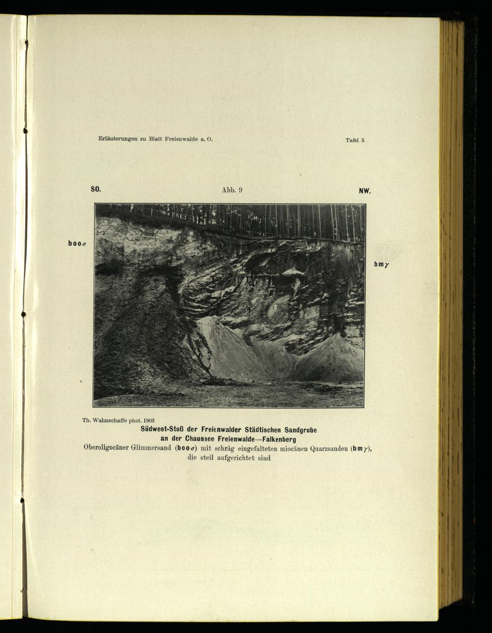Th. Wahnschaffe phot. 1908 Südwest-Stoß der Freienwalder Städtischen Sandgrube an der Chaussee FreienwaldeFalkenberg Oberoligocäner Glimmersand(boos) mit schräg eingefalteten miocänen Quarzsanden(bm 7), die steil aufgerichtet sind