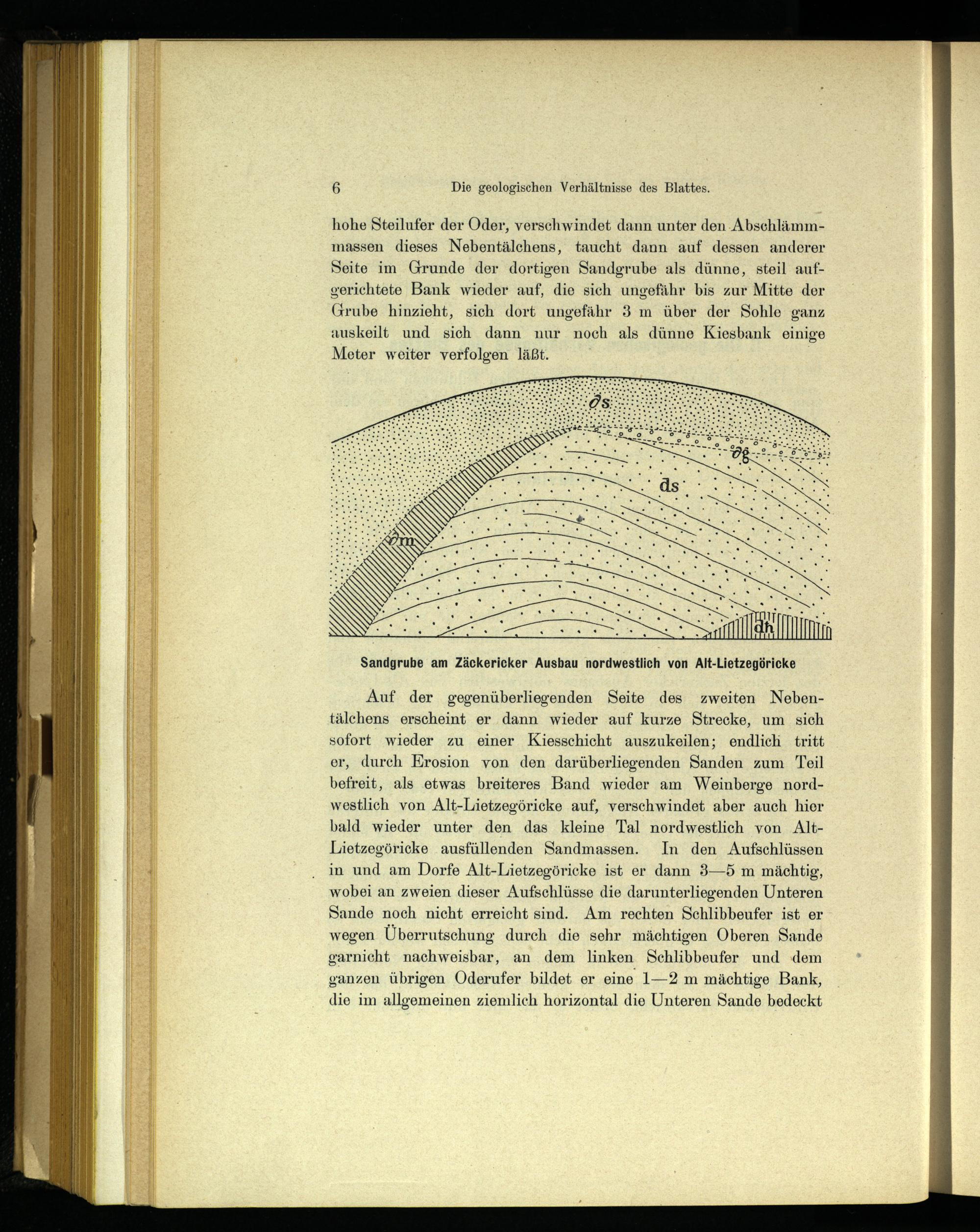 Auf der gegenüberliegenden Seite des zweiten Nebentälchens erscheint er dann wieder auf kurze Strecke, um sich sofort wieder zu einer Kiesschicht auszukeilen; endlich tritt er, durch Erosion von den darüberliegenden Sanden zum Teil befreit, als etwas breiteres Band wieder am Weinberge nordwestlich von Alt-Lietzegöricke auf, verschwindet aber auch hier bald wieder unter den das kleine Tal nordwestlich von AltLietzegöricke ausfüllenden Sandmassen. In den Aufschlüssen in und am Dorfe Alt-Lietzegöricke ist er dann 3—5 m mächtig, wobei an zweien dieser Aufschlüsse die darunterliegenden Unteren Sande noch nicht erreicht sind. Am rechten Schlibbeufer ist er wegen Überrutschung durch die sehr mächtigen Oberen Sande garnicht nachweisbar, an dem linken Schlibbeufer und dem ganzen übrigen Oderufer bildet er eine 1—2 m mächtige Bank, die im allgemeinen ziemlich horizontal die Unteren Sande bedeckt