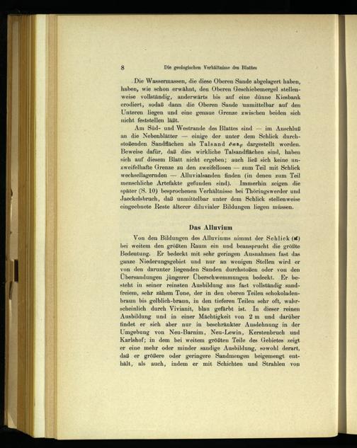 Von den Bildungen des Alluviums nimmt der Schlick(st) bei weitem den größten Raum ein und beansprucht die größte Bedeutung. Er bedeckt mit sehr geringen Ausnahmen fast das ganze. Niederungsgebiet und nur an wenigen Stellen wird er von den darunter liegenden Sanden durchstoßen oder von den Übersandungen jüngerer Überschwemmungen bedeckt. Er besteht in seiner reinsten Ausbildung aus fast vollständig sandfreiem, sehr zähem Tone, der in den oberen Teilen schokoladenbraun bis gelblich-braun, in den tieferen Teilen sehr oft, wahrscheinlich durch Vivianit, blau gefärbt ist. In dieser reinen Ausbildung und in einer Mächtigkeit von 2m und darüber findet er sich aber nur in beschränkter Ausdehnung in der Umgebung von Neu-Barnim, Neu-Lewin , Kerstenbruch und Karlshof; in dem bei weitem größten Teile des Gebietes zeigt. er eine mehr oder minder sandige Ausbildung, sowohl derart, daß er größere oder geringere Sandmengen beigemengt enthält, als auch, indem er mit Schichten und Strahlen von