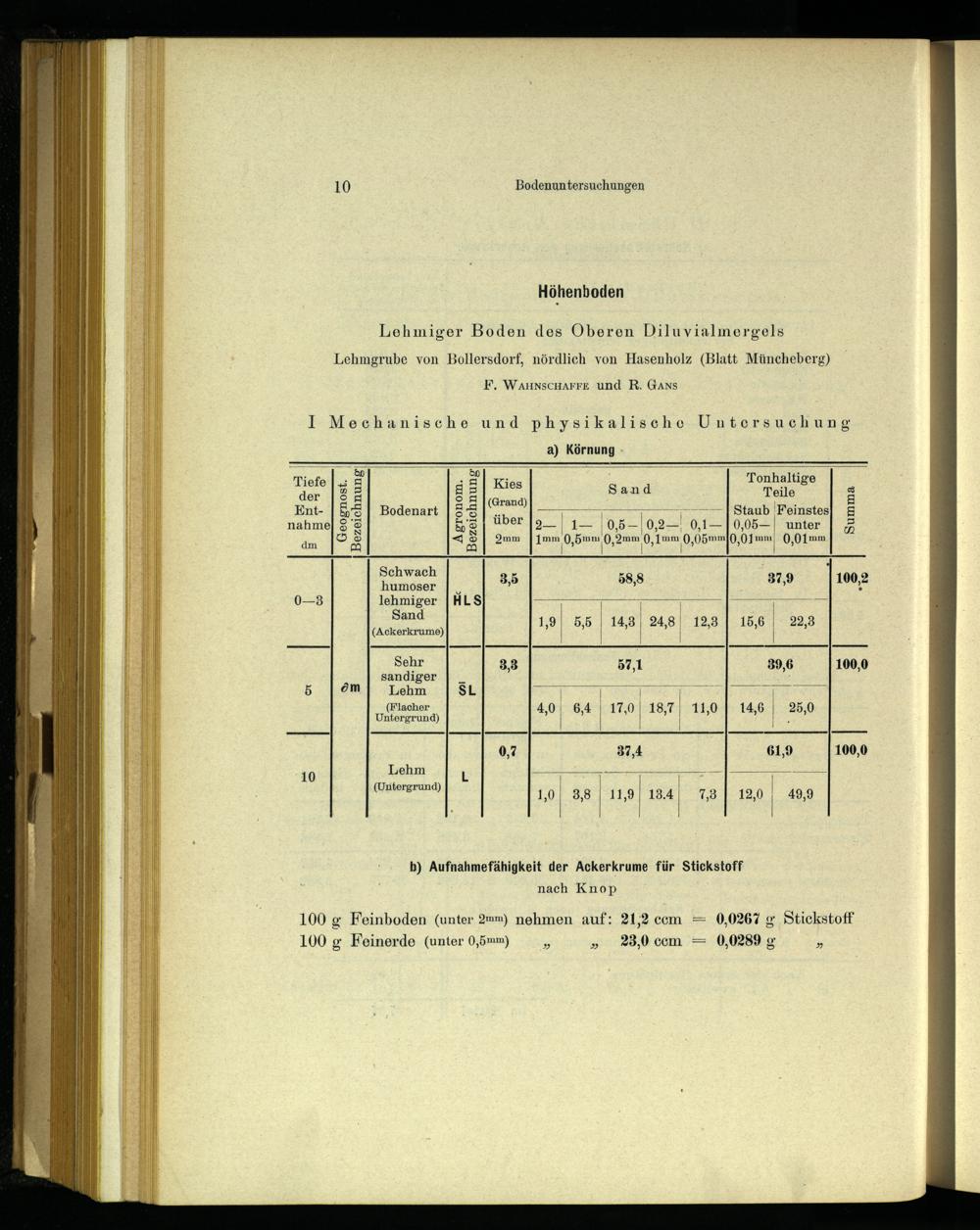 100 g Feinboden(unter 2mm) nehmen auf: 21,2 ccm= 0,0267 x Stickstoff 100 g Feinerde(unter 0,5mm) 7„28,0 com 0,0289&»