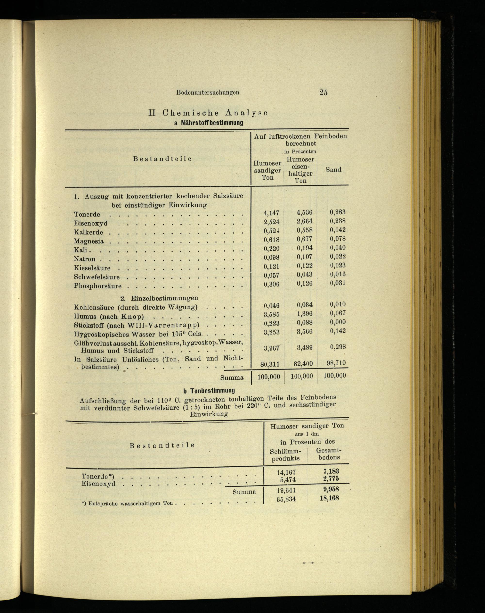 1. Auszug mit konzentrierter kochender Salzsäure bei einstündiger Einwirkung Tonerde+ 2. NEN 4,147| 4,5361 0,283 Eisenoxyd 2. 0. 0 N de 2,524| 2,664 0,288 Kalkerde... 2. 2000 0,521 0,558! 0,042 Magnesia,.. 0.0.00 0 4 0,618 0,677|: 0,078 Kali: 1 0 NN el 0,220 0,194| 0,040 Natron... 2.0.0.0. N 0,098 0,107| 0,022 Kieselsäure.......0.000 4 0,121 0,122 0,028 Schwefelsäure: 1. 4.000400 Ve 0,057 0,043 0,016 Phosphorsäure.: 1... 0.0.0.0 WEN 0,306 0,126 0,081