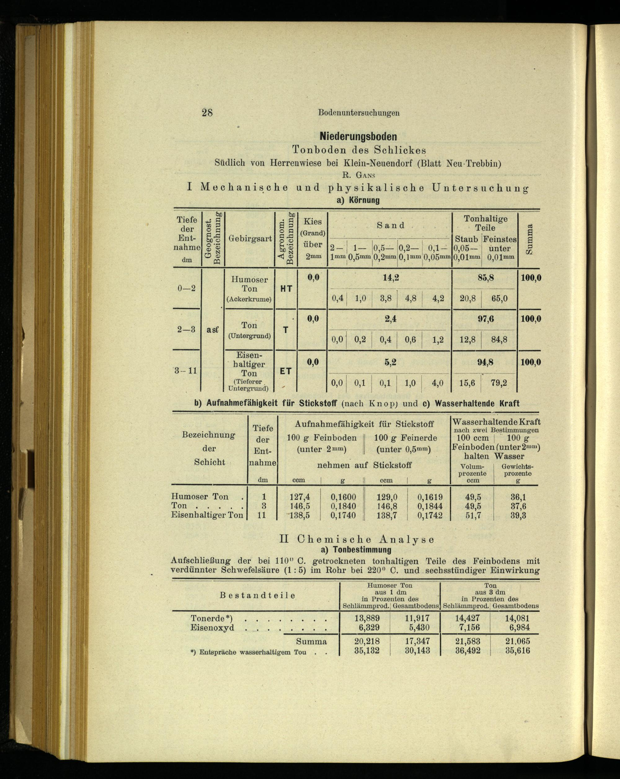 Niederungsboden Tonboden des Schlickes Südlich von Herrenwiese bei Klein-Neuendorf(Blatt Neu-Trebbin) R. Gans I Mechanische und physikalische Untersuchung a) Körnung