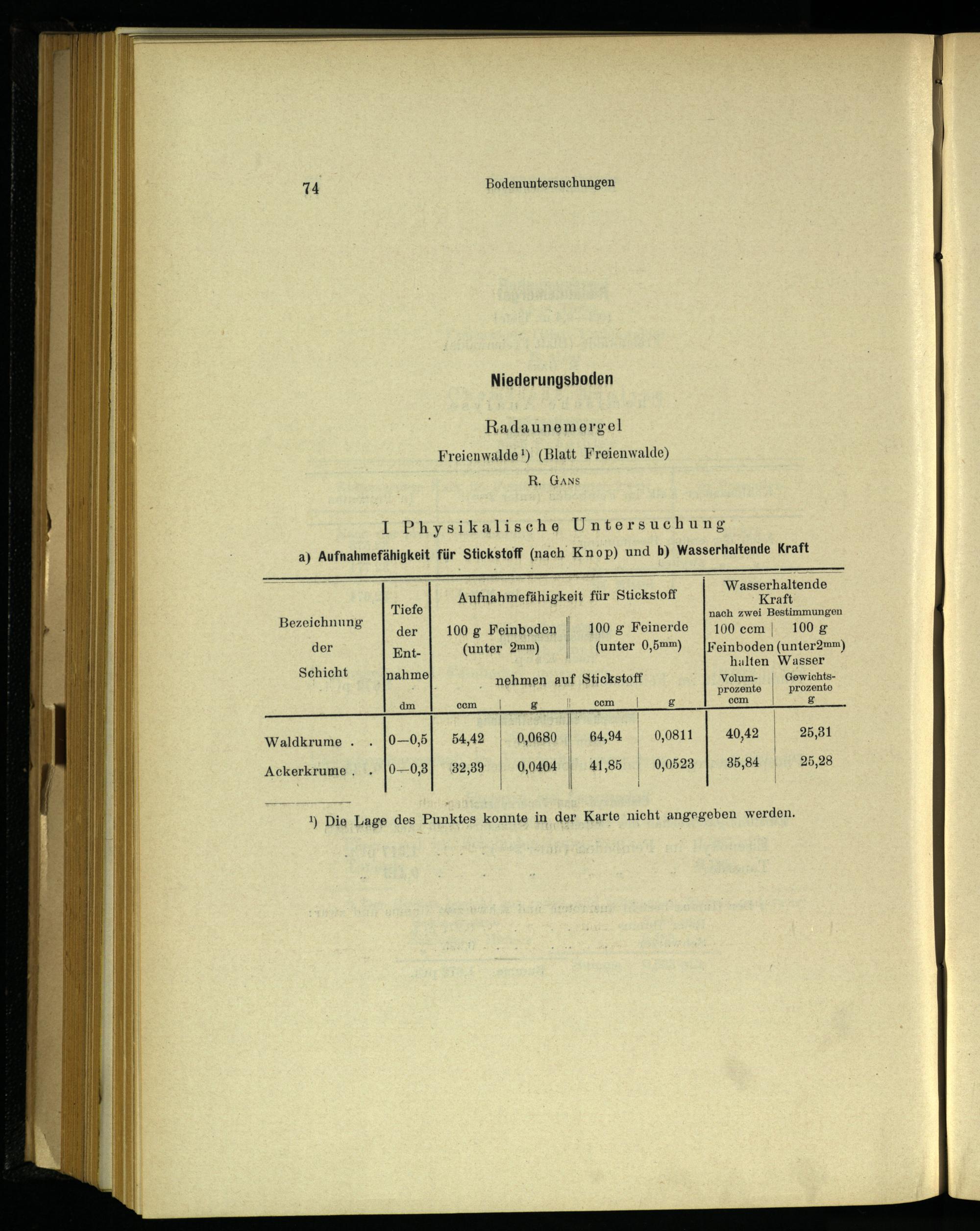 Tiefe Aufnahmefähigkeit für Stickstoff Walt fl nach zwei Bestimmungen der| 100 g Feinboden 100 g Feinerde| 100 cem| 100g der Ent-(unter 2mm)|(unter 0,5mm) Feinboden(unter2mm) halten Wasser