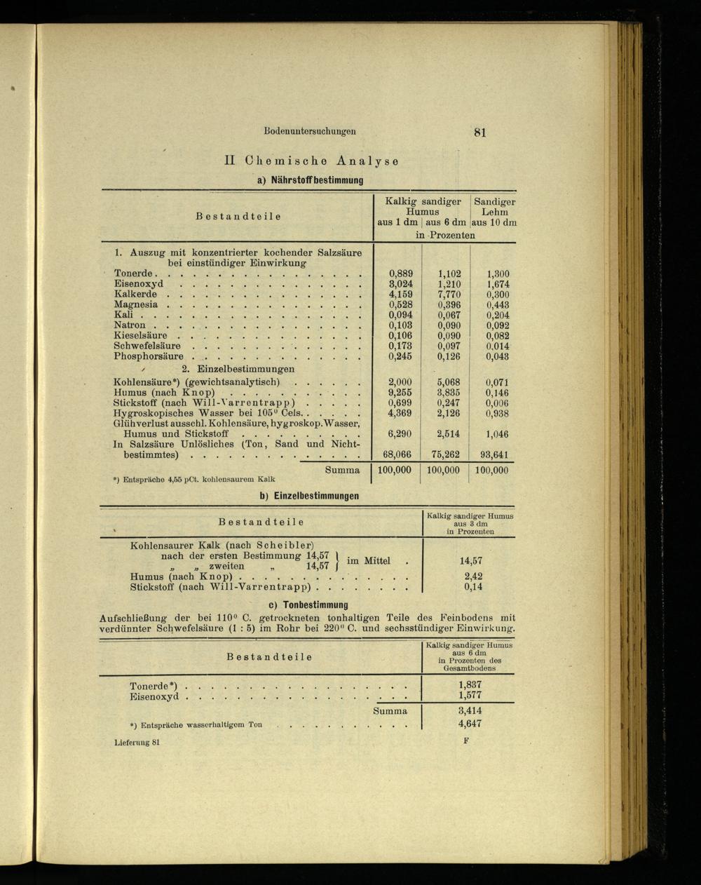 Kohlensaurer Kalk (nach Scheibler) nach der ersten Bestimmung 14,57|. x 5: zweiten; 14,57| im Mittel. 14,57 Humus(nach Knop).. KR 2,42 Stickstoff(nach Will--Varrentrapp). Rn 0,14