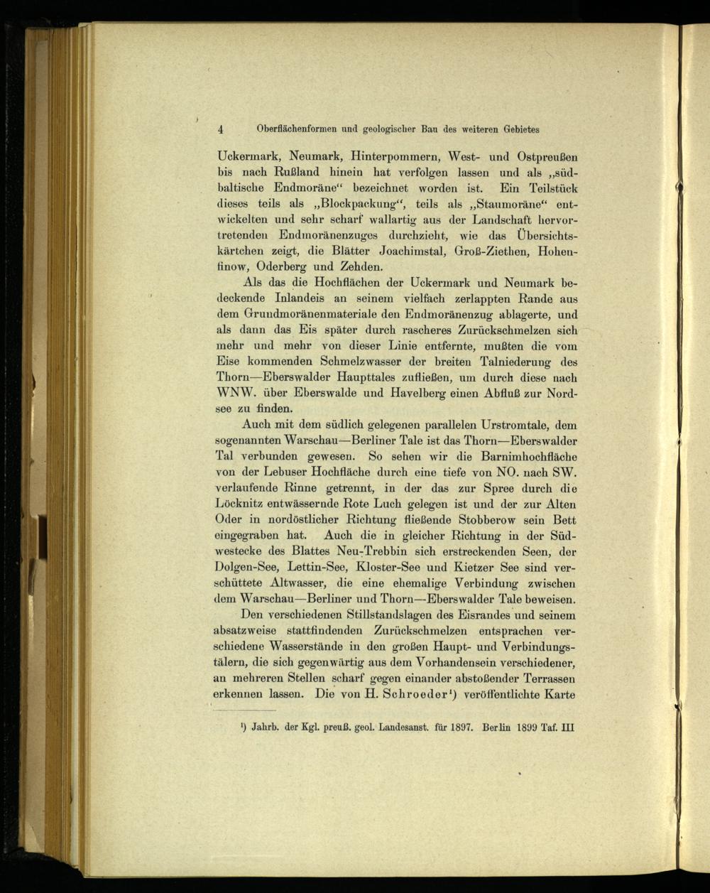 Uckermark , Neumark , Hinterpommern, West- und Ostpreußen bis nach Rußland hinein hat verfolgen lassen und als„südbaltische Endmoräne‘“ bezeichnet worden ist. Kin Teilstück dieses teils als„Blockpackung‘, teils als„Staumoräne“ entwickelten und sehr scharf wallartig aus der Landschaft hervortretenden Endmoränenzuges durchzieht, wie das Übersichtskärtchen zeigt, die Blätter Joachimstal , Groß-Ziethen, Hohen finow , Oderberg und Zehden .