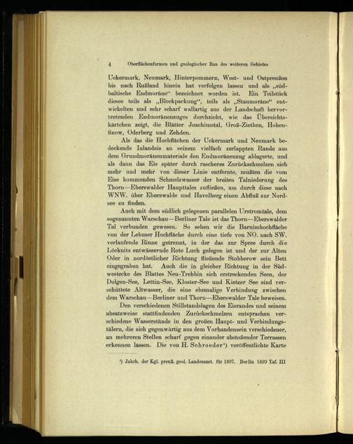 Als das die Hochflächen der Uckermark und Neumark bedeckende Inlandeis an seinem vielfach zerlappten Rande aus dem Grundmoränenmateriale den Endmoränenzug ablagerte, und als dann das Kis später durch rascheres Zurückschmelzen sich mehr und mehr von dieser Linie entfernte, mußten die vom Eise kommenden Schmelzwasser der breiten Talniederung des Thorn—KEberswalder Haupttales zufließen, um durch diese nach WNW. über Eberswalde und Havelberg einen Abfluß zur Nordsee zu finden.