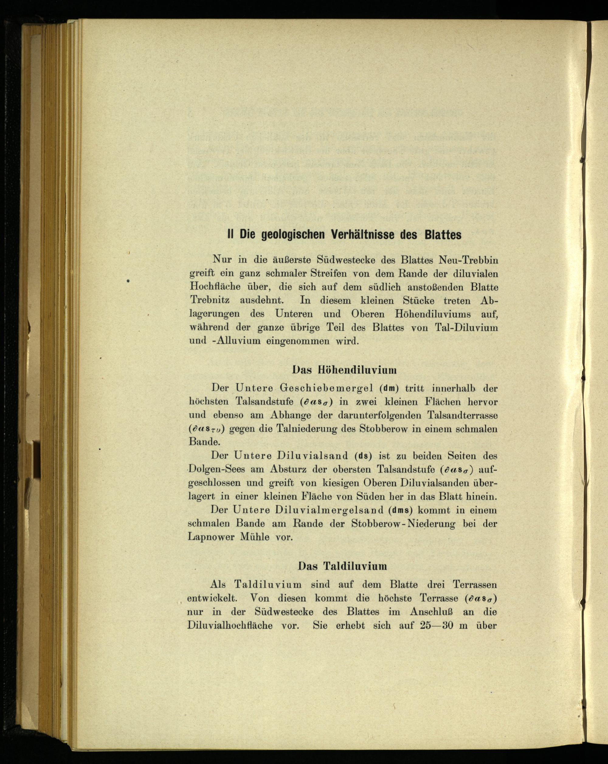 Der Untere Geschiebemergel(dm) tritt innerhalb. der höchsten Talsandstufe(0asg) in zwei kleinen Flächen hervor und ebenso am Abhange der darunterfolgenden Talsandterrasse (ö«s-„) gegen die Talniederung des Stobberow in einem schmalen Bande.