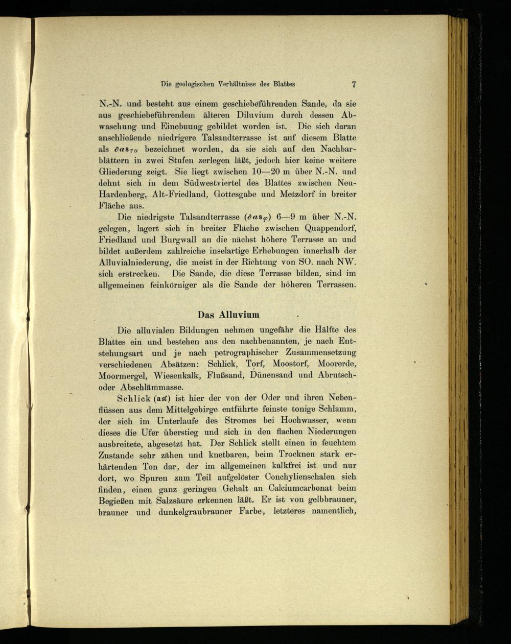 N.-N. und besteht aus einem geschiebeführenden Sande, da sie aus geschiebeführendem älteren Diluvium durch dessen Abwaschung und Einebnung gebildet worden ist. Die sich daran anschließende niedrigere Talsandterrasse ist auf diesem Blatte als öas-u bezeichnet worden, da sie sich auf den Nachbarblättern in zwei Stufen zerlegen läßt, jedoch hier keine weitere Gliederung zeigt. Sie liegt zwischen 10—20 m über N.-N. und dehnt sich in dem Südwestviertel des Blattes zwischen Neu Hardenberg , Alt-Friedland, Gottesgabe und Metzdorf in breiter Fläche aus.