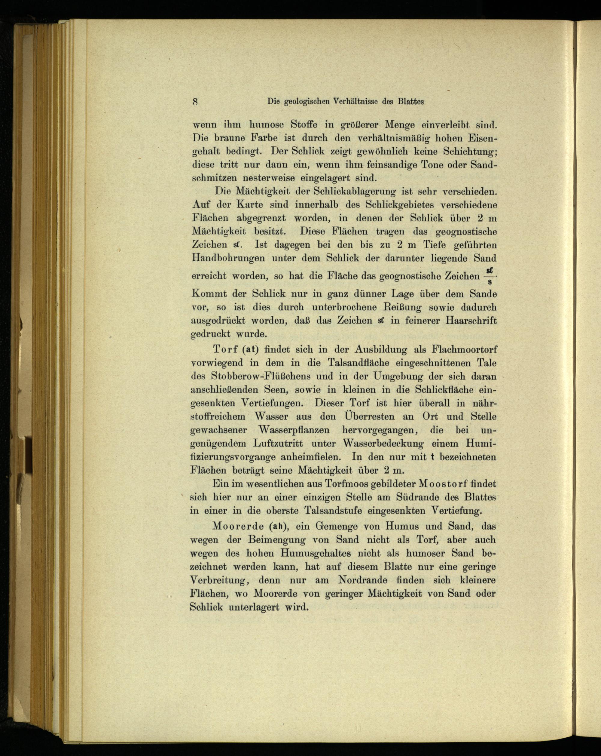 Torf(at) findet sich in der Ausbildung als Flachmoortorf vorwiegend in dem in die Talsandfläche eingeschnittenen Tale des Stobberow-Flüßchens und in der Umgebung der sich daran anschließenden Seen, sowie in kleinen in die Schlickfläche eingesenkten Vertiefungen. Dieser Torf ist hier überall in nährstoffreichem Wasser aus den Überresten an Ort und Stelle gewachsener Wasserpflanzen hervorgegangen, die bei ungenügendem Luftzutritt unter Wasserbedeckung einem Humifizierungsvorgange anheimfielen. In den nur mit t bezeichneten Flächen beträgt seine Mächtigkeit über 2 m.