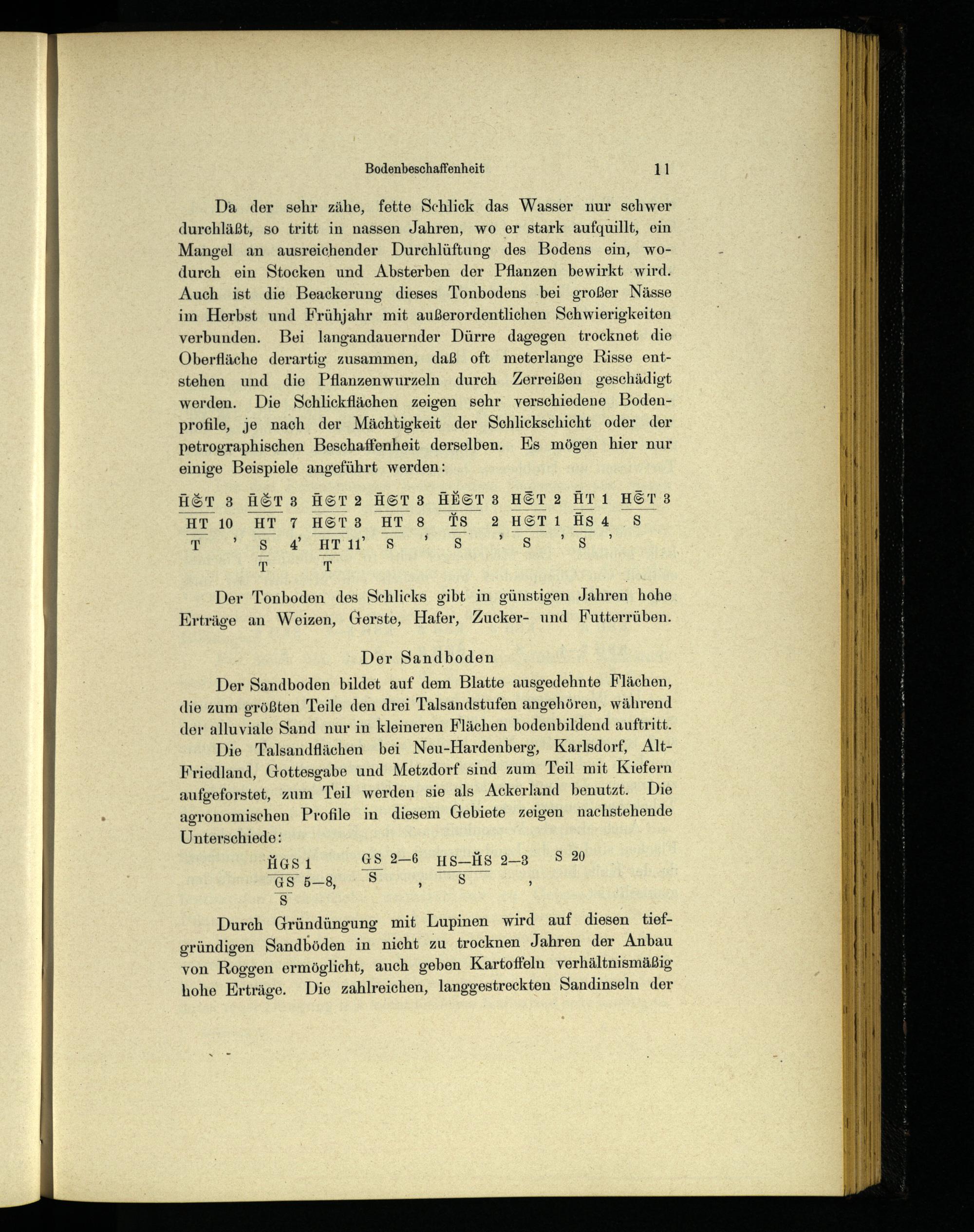 Da der sehr zähe, fette Schlick das Wasser nur schwer durchläßt, so tritt in nassen Jahren, wo er stark aufquillt, ein Mangel an ausreichender Durchlüftung des Bodens ein, wodurch ein Stocken und Absterben der Pflanzen bewirkt ‚wird. Auch ist die Beackerung dieses Tonbodens.bei großer Nässe im Herbst und Frühjahr mit außerordentlichen Schwierigkeiten verbunden. Bei langandauernder Dürre dagegen trocknet die Oberfläche derartig zusammen, daß oft meterlange Risse entstehen und die Pflanzenwurzeln durch Zerreißen geschädigt werden. Die Schlickflächen zeigen sehr verschiedene Bodenprofile, je nach der Mächtigkeit der Schlickschicht oder der petrographischen Beschaffenheit derselben. Es mögen hier nur einige Beispiele angeführt werden: äGT 3 HAGT3 HGT2 HAGTS HEGT3S HET2 AT1 HET 3 "HT 10 HT 7 HGT3S HT 8S 78 2 HETI ÜSs4 SS. NS HL Ss 8)