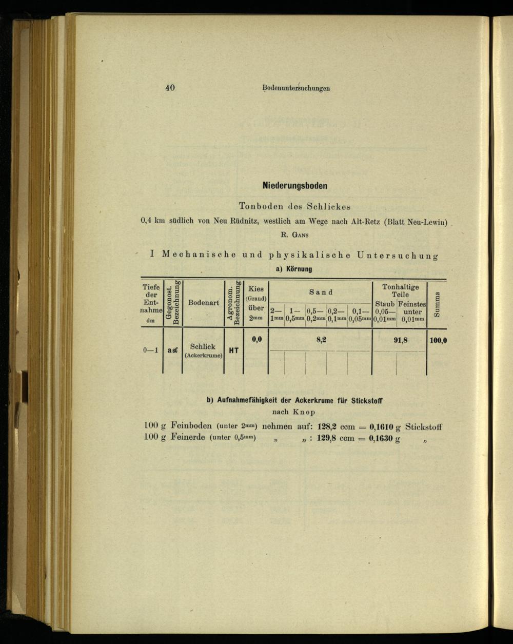 b) Aufnahmefähigkeit der Ackerkrume für Stickstoff nach Knop 100 g Feinboden(unter 2mm) nehmen auf: 128,2 ccm= 0,1610 g Stickstoff 100 g Feinerde(unter 0,5mm)%„: 129,8 com= 0,1630 g n