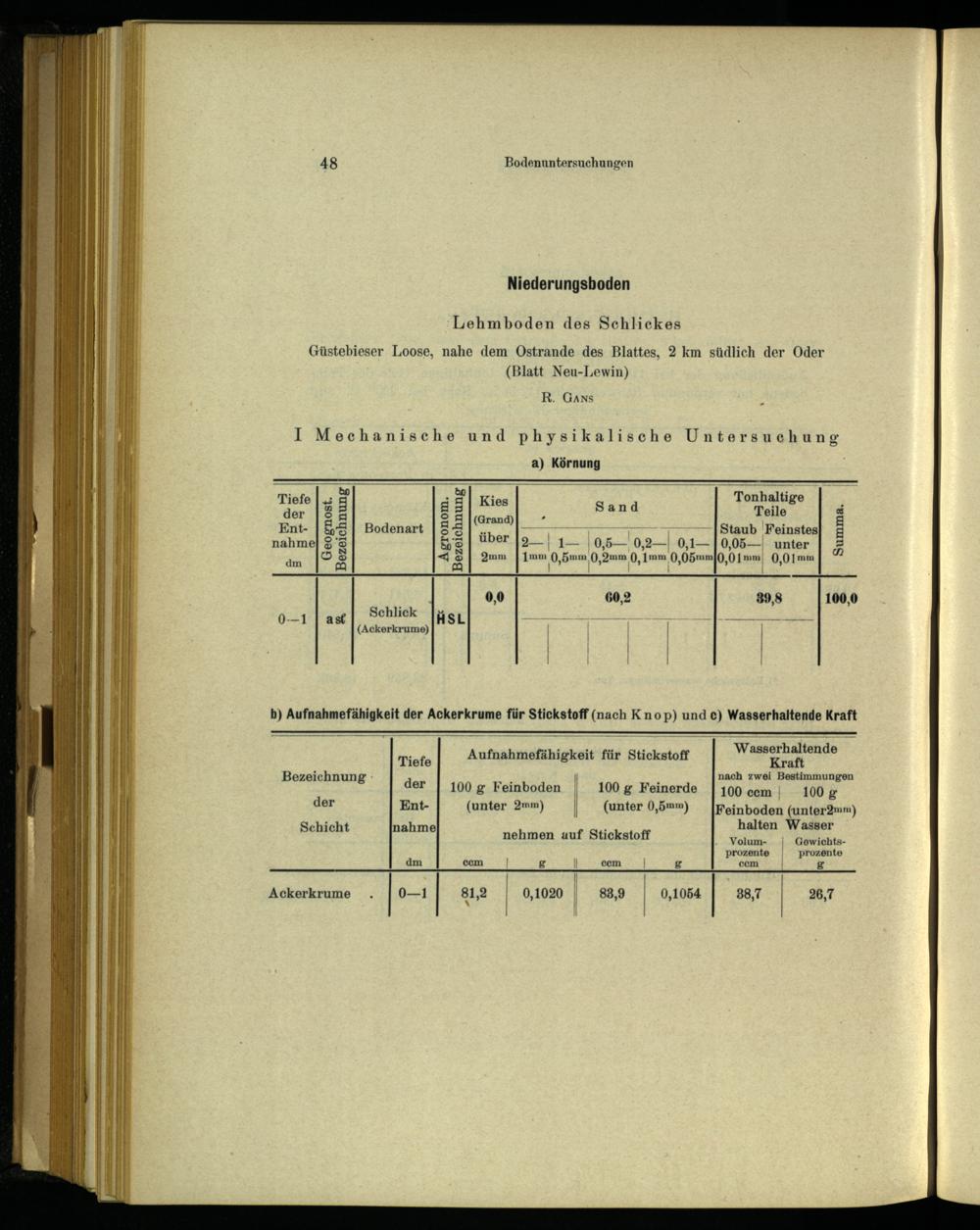 b) Aufnahmefähigkeit der Ackerkrume für Stickstoff(nach Knop) und c) Wasserhaltende Kraft