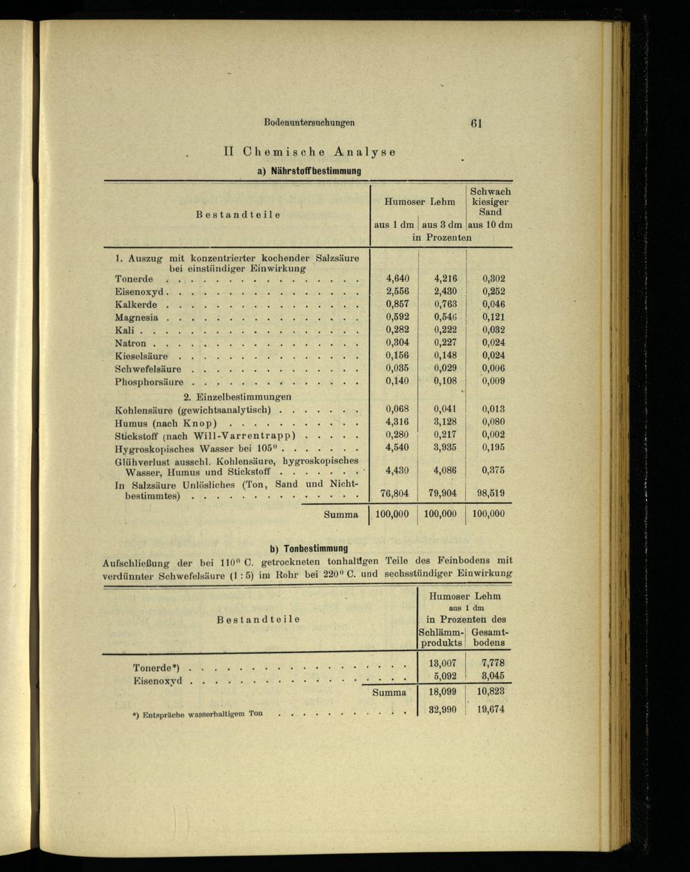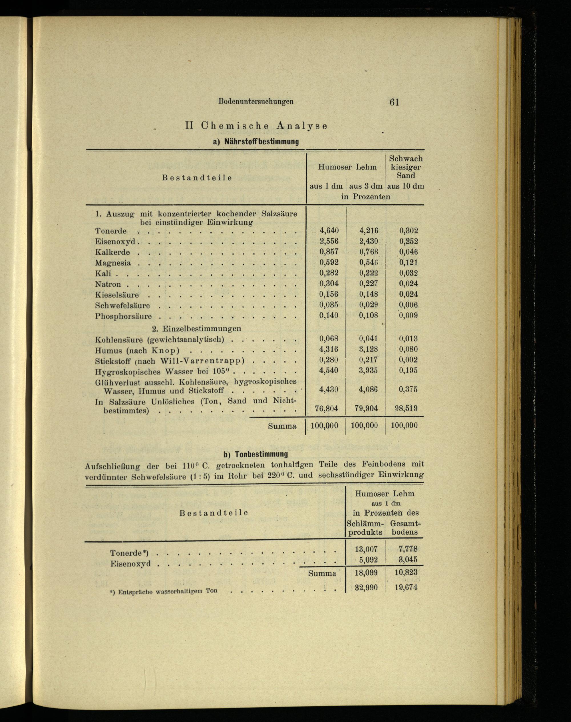 b) Tonbestimmung Aufschließung der bei 110° C. getrockneten tonhaltigen Teile des Feinbodens mit verdünnter Schwefelsäure(1:5) im Rohr bei 220° C. und sechsstündiger Einwirkung EL