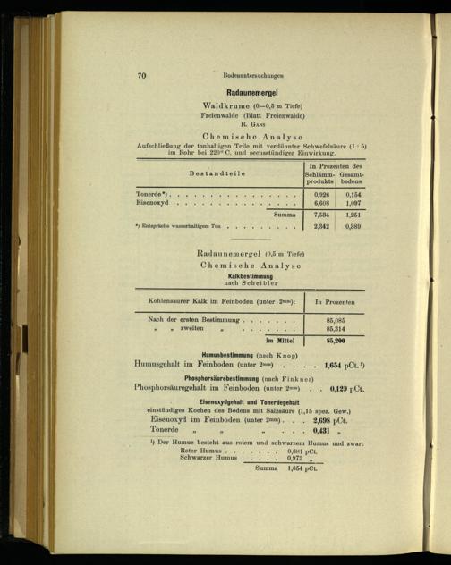 Eisenoxydgehalt und Tonerdegehalt einstündiges Kochen des Bodens mit Salzsäure(1,15 spez. Gew.) Eisenoxyd im Feinboden(unter 2mm), ‚ ‚ 2,698 pCt. Tonerde,””. 041,