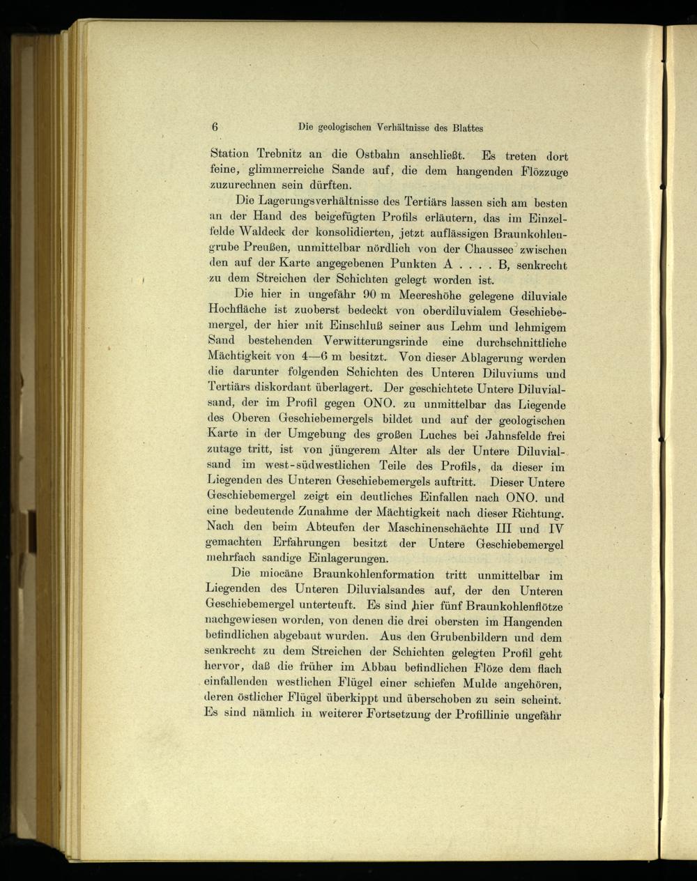 Die Lagerungsverhältnisse des Tertiärs lassen sich am besten an der Hand des beigefügten Profils erläutern, das im KEinzelfelde Waldeck der konsolidierten, jetzt auflässigen Braunkohlengrube Preußen, unmittelbar nördlich von der Chaussee zwischen den auf der Karte angegebenen Punkten A.... B, senkrecht zu dem Streichen der Schichten gelegt worden. ist.