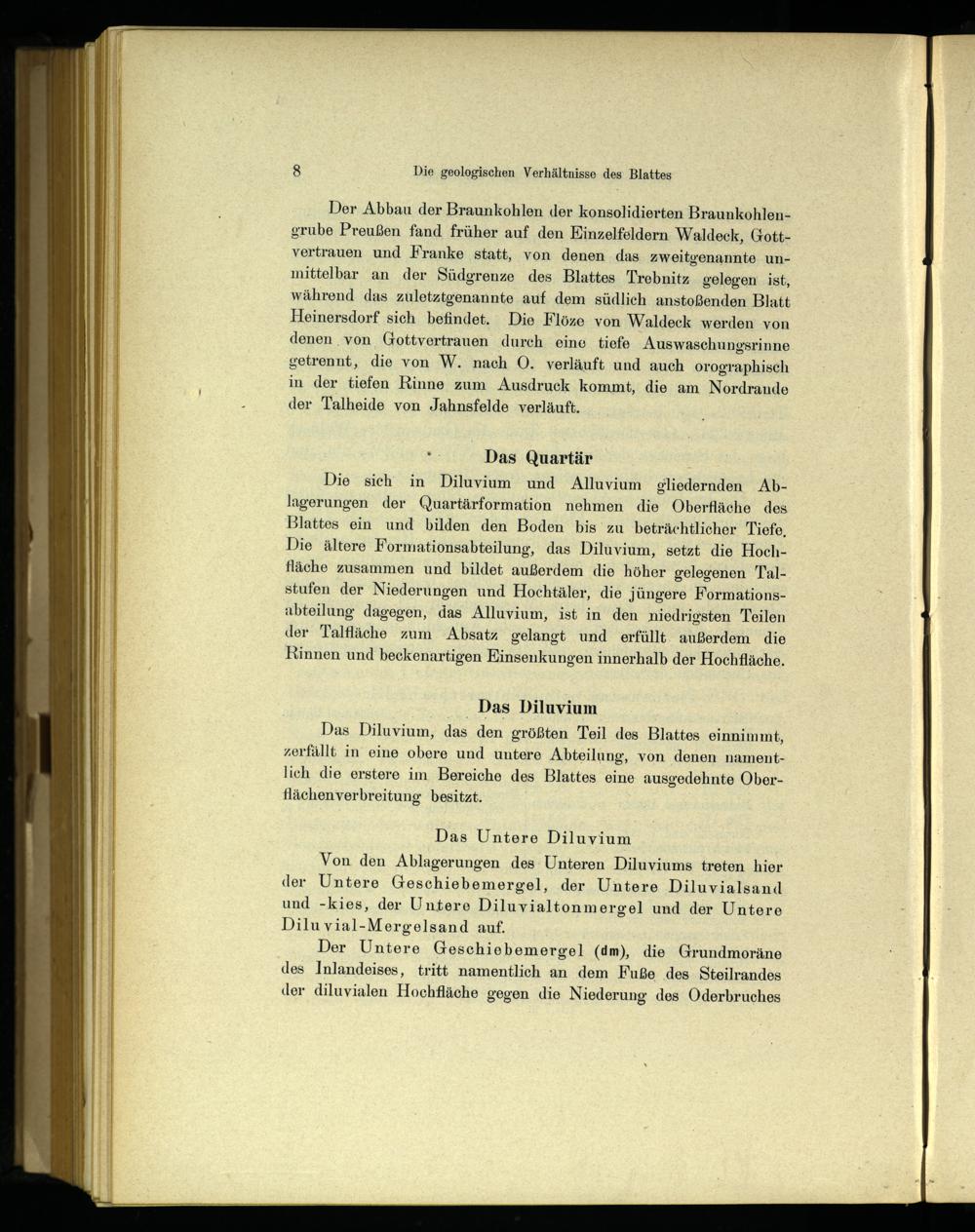 Der Abbau der Braunkohlen der konsolidierten Braunkohlengrube Preußen fand früher auf den Einzelfeldern Waldeck, Gottvertrauen und Franke statt, von denen das zweitgenannte unmittelbar an der Südgrenze des Blattes Trebnitz gelegen ist, während das zuletztgenannte auf dem südlich anstoßenden Blatt Heinersdorf sich befindet. Die Flöze von Waldeck werden von denen von Gottvertrauen durch eine tiefe Auswaschungsrinne getrennt, die von W. nach O. verläuft und auch orographisch in der tiefen Rinne zum Ausdruck kommt, die am Nordrande der Talheide von Jahnsfelde verläuft.