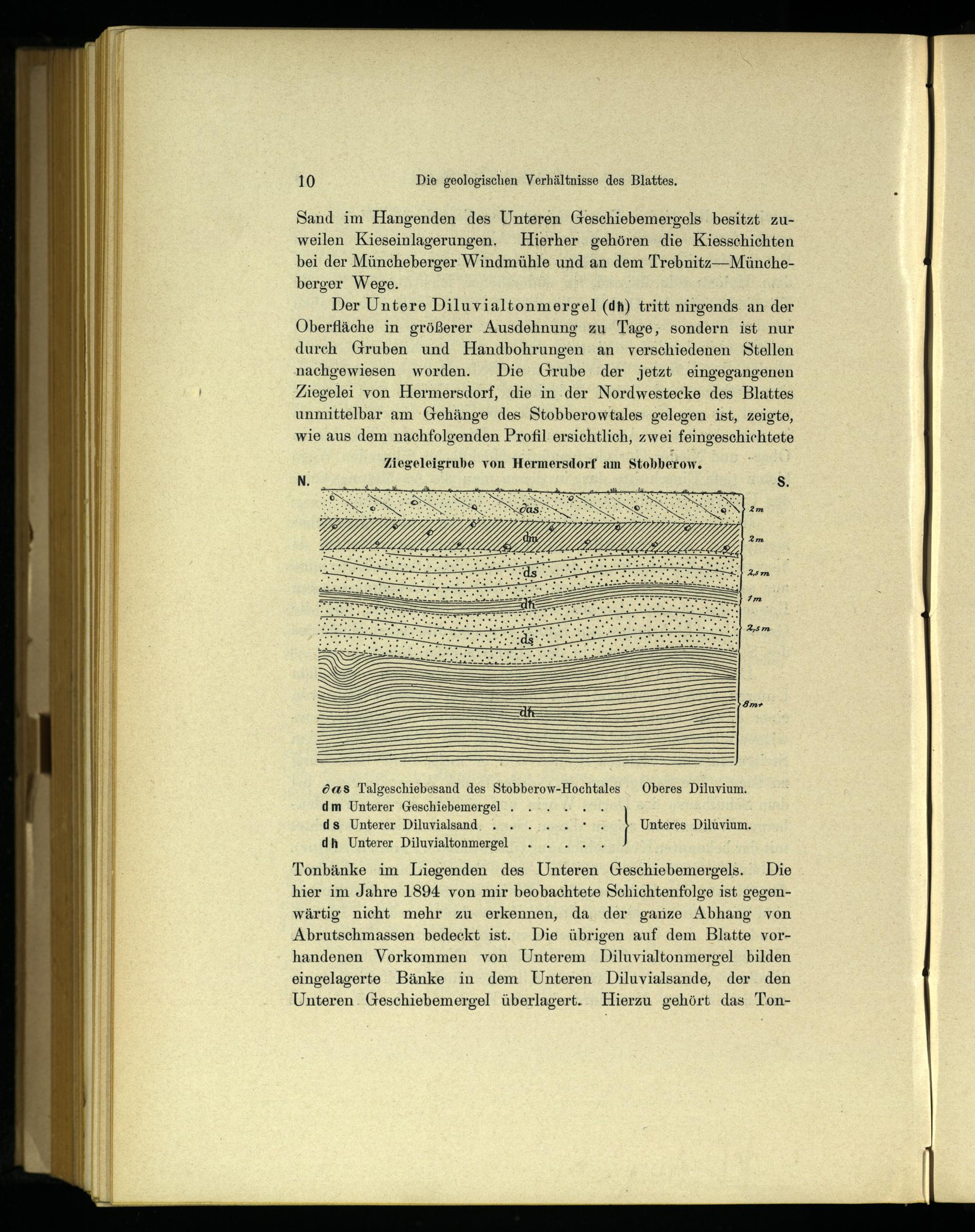 Der Untere Diluvialtonmergel(di) tritt nirgends an der Oberfläche in größerer Ausdehnung zu Tage, sondern ist nur durch Gruben und Handbohrungen an verschiedenen Stellen nachgewiesen worden. Die Grube der jetzt eingegangenen Ziegelei von Hermersdorf, die in der Nordwestecke des Blattes unmittelbar am Gehänge des Stobberowtales gelegen ist, zeigte, wie aus dem nachfolgenden Profil ersichtlich, zwei feingeschichtete