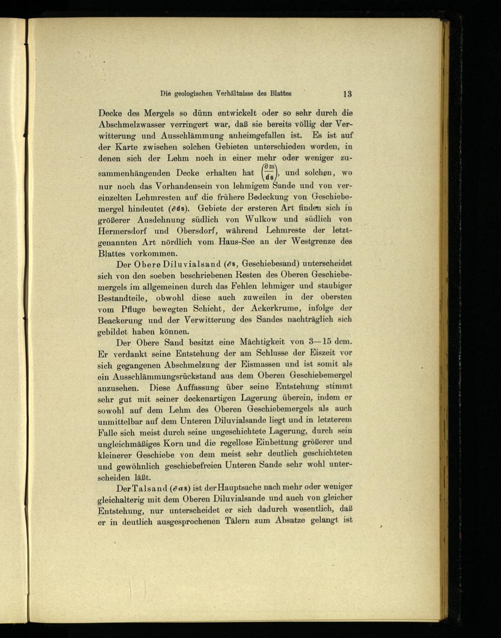 Der Obere Diluvialsand(ös, Geschiebesand) unterscheidet sich von den soeben beschriebenen Resten des Oberen Geschiebemergels im allgemeinen durch das Fehlen lehmiger und staubiger Bestandteile, obwohl diese auch zuweilen in der obersten vom Pfluge bewegten Schicht, der Ackerkrume, infolge der Beackerung und der Verwitterung des Sandes nachträglich sich gebildet haben können.