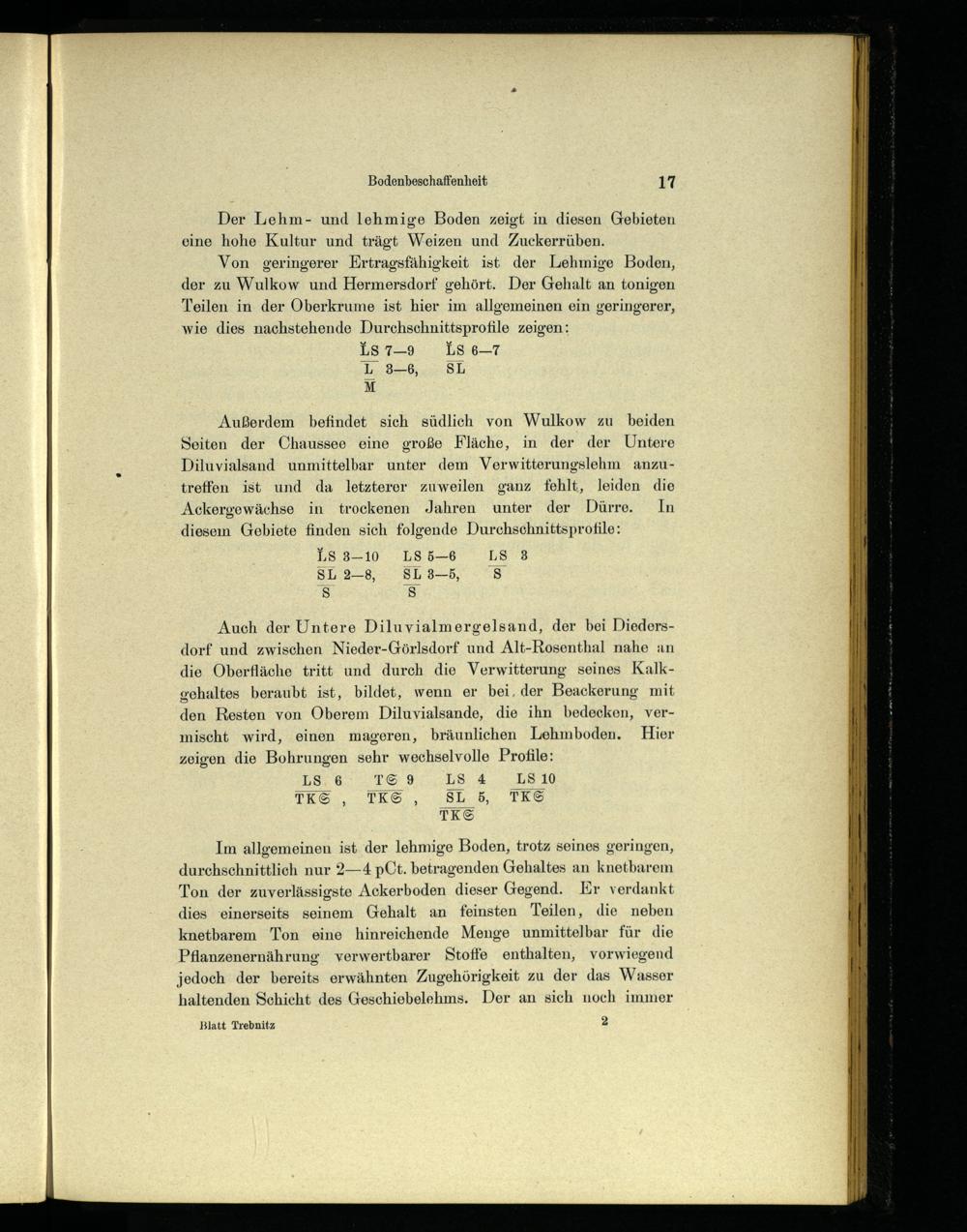 Außerdem befindet sich südlich von Wulkow zu beiden Seiten der Chaussee eine große Fläche, in der der Untere Diluvialsand unmittelbar unter dem Verwitterungslehm anzutreffen ist und da letzterer zuweilen ganz fehlt, leiden die Ackergewächse in trockenen Jahren unter der Dürre. In diesem Gebiete finden sich folgende Durchschnittsprofile: