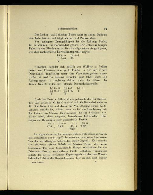 Von geringerer Ertragsfähigkeit ist der Lehmige Boden, der zu Wulkow und Hermersdorf gehört. Der Gehalt an tonigen Teilen in der Oberkrume ist hier im allgemeinen ein geringerer, wie dies nachstehende Durchschnittsprofile zeigen: