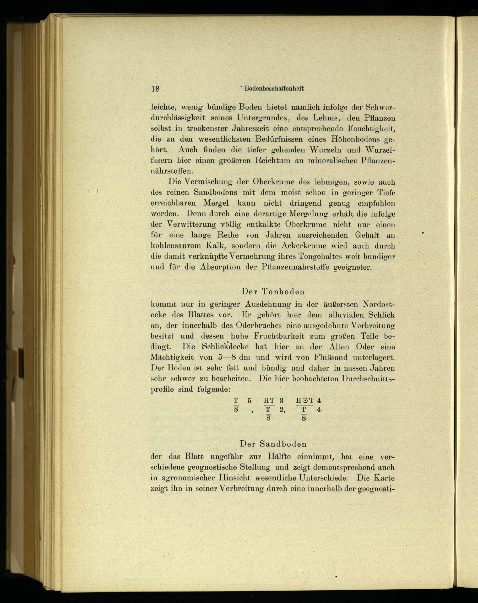 kommt nur in geringer Ausdehnung in der äußersten Nordostecke des Blattes vor. Er gehört hier dem alluvialen Schlick an, der innerhalb des Oderbruches eine ausgedehnte Verbreitung besitzt und dessen hohe Fruchtbarkeit zum großen Teile bedingt. Die Schliekdecke hat hier an der Alten Oder eine Mächtigkeit von 5—8 dm und wird von Flußsand unterlagert. Der Boden ist sehr fett und bündig und daher in nassen Jahren sehr schwer zu bearbeiten. Die hier beobachteten Durchschnittsprofile sind folgende: