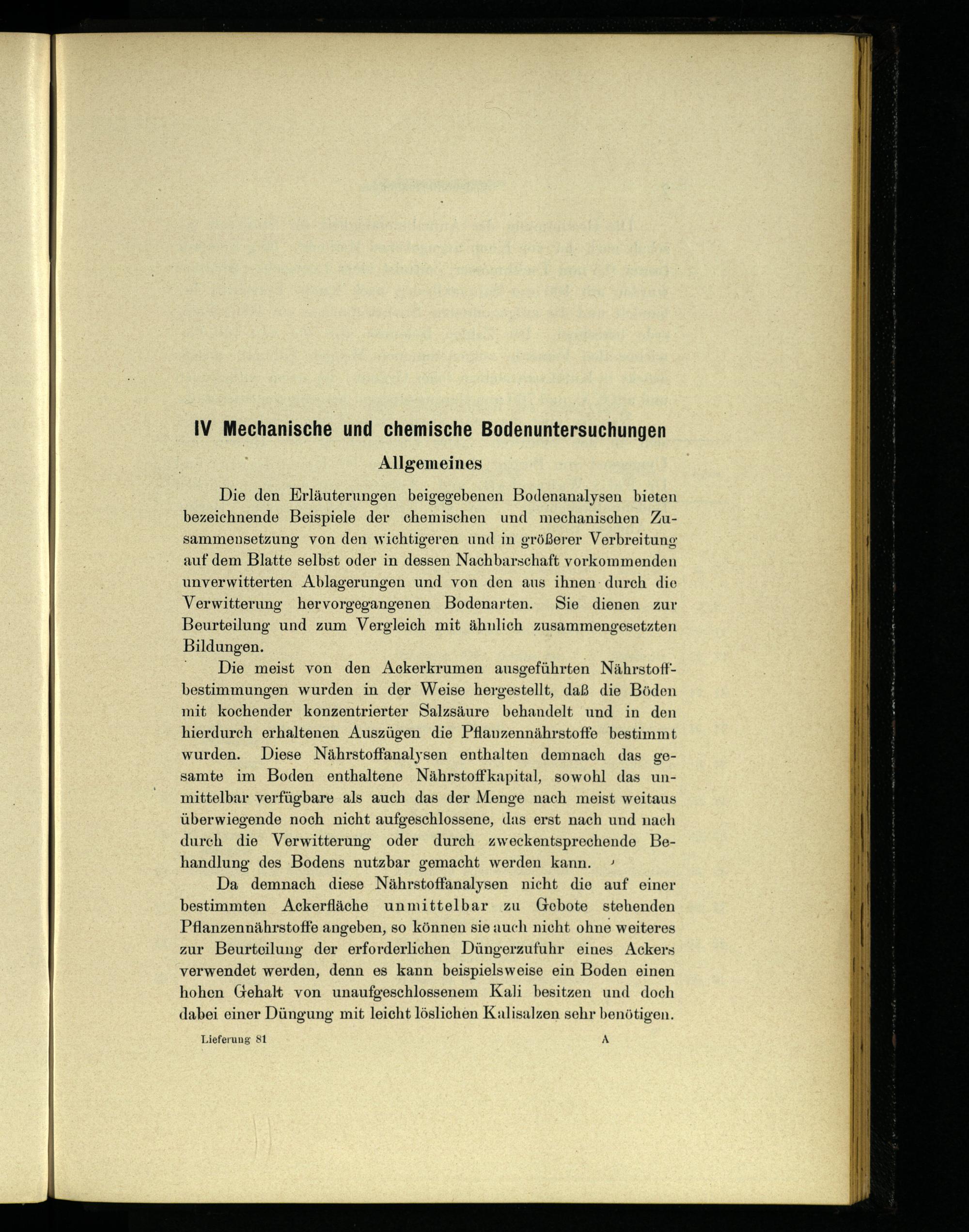 Da demnach diese Nährstoffanalysen nicht die auf einer bestimmten Ackerfläche unmittelbar zu Gebote stehenden Pflanzennährstoffe angeben, so können sie auch nicht ohne weiteres zur Beurteilung der erforderlichen Düngerzufuhr eines Ackers verwendet werden, denn es kann beispielsweise ein Boden einen hohen Gehalt von unaufgeschlossenem Kali besitzen und doch dabei einer Düngung mit leicht löslichen Kalisalzen sehr benötigen.