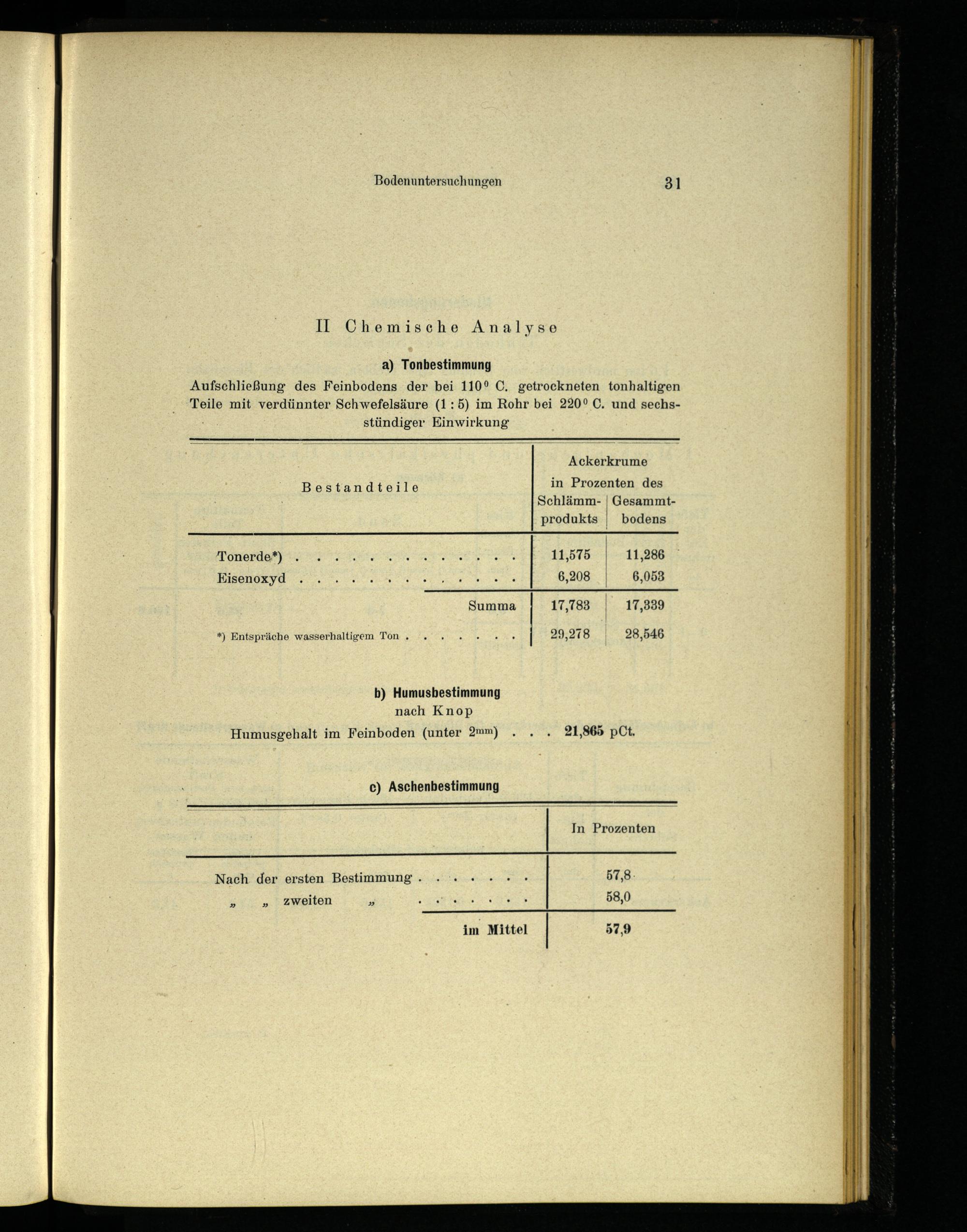 a) Tonbestimmung Aufschließung des Feinbodens der bei 110° C. getrockneten tonhaltigen Teile mit verdünnter Schwefelsäure(1:5) im Rohr bei 220° C. und sechsstündiger Einwirkung Ackerkrume in Prozenten des Schlämm-| Gesammtprodukts| bodens
