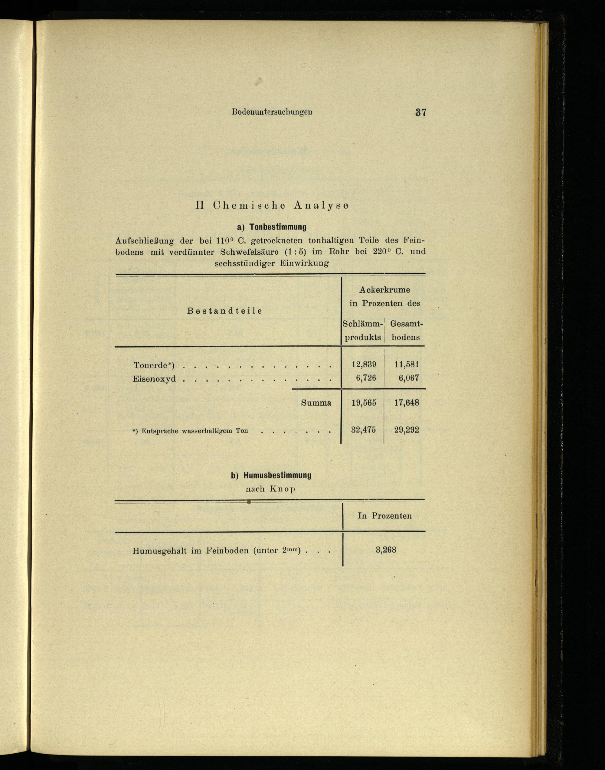 a) Tonbestimmung Aufschließung der bei 110° C. getrockneten tonhaltigen Teile des Feinbodens mit verdünnter Schwefelsäuro(1:5) im Rohr bei 220° C. und sechsstündiger Einwirkung