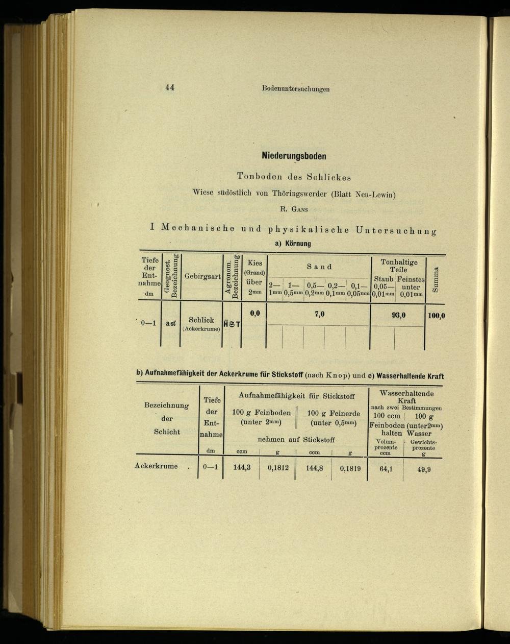 miese| Aufnahmefähigkeit für Stickstoff Var Bezeichnung 1efe nach zwei Bestimmungen ; der 100 g Feinboden 100 g Feinerde| 100 ccm 100 g der Ent-(unter 2mm)(unter 0,5»m)|Feinboden(unter2mm) Schicht halten Wasser nahme nehmen auf Stickstoff Volum -|} Gewichtsprozente Prozente dm ccm| g Il com| g ccm g mL NO eg 0 oe com| gg |]|} Ackerkrume| 0—1 144,3| 0,1812 144,8| 0,1819 64,1 49,9