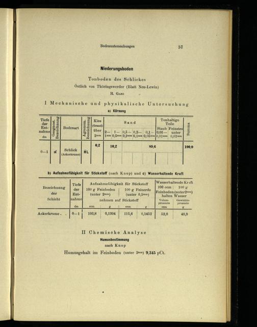 Bezeichnung A; er der| 100 g Feinboden| 100 g Veinerde Feinboden(unter2ww) der Ent-(unter 2mm)](unter 0,5mm) halten Wasser Schicht nahme nehmen auf Stickstoff Volum-| Gewichts. prozente prozente
