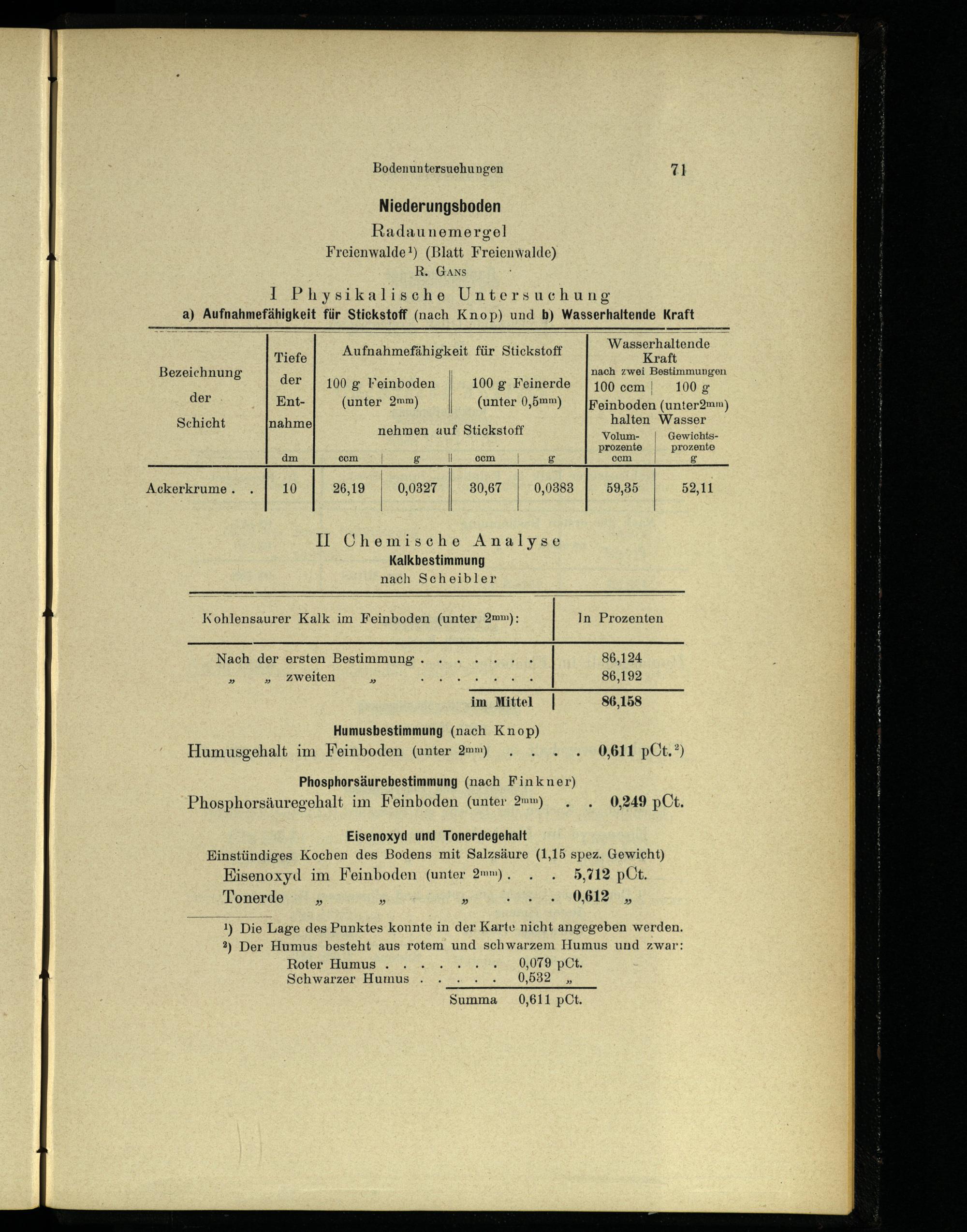 Niederungsboden Radaunemergel Freienwalde!)(Blatt Freienwalde) R. Gans I] Physikalische Untersuchung a) Aufnahmefähigkeit für Stickstoff(nach Knop) und b) Wasserhaltende Kraft