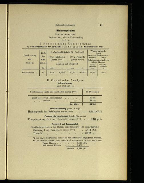 Humusbestimmung(nach Knop) Humusgehalt im Feinboden(unter 2mm) 0,611 pCt.?) Phosphorsäurebestimmung(nach Finkner) Phosphorsäuregehalt im Feinboden(unter 2mm) 0,249 pCt.