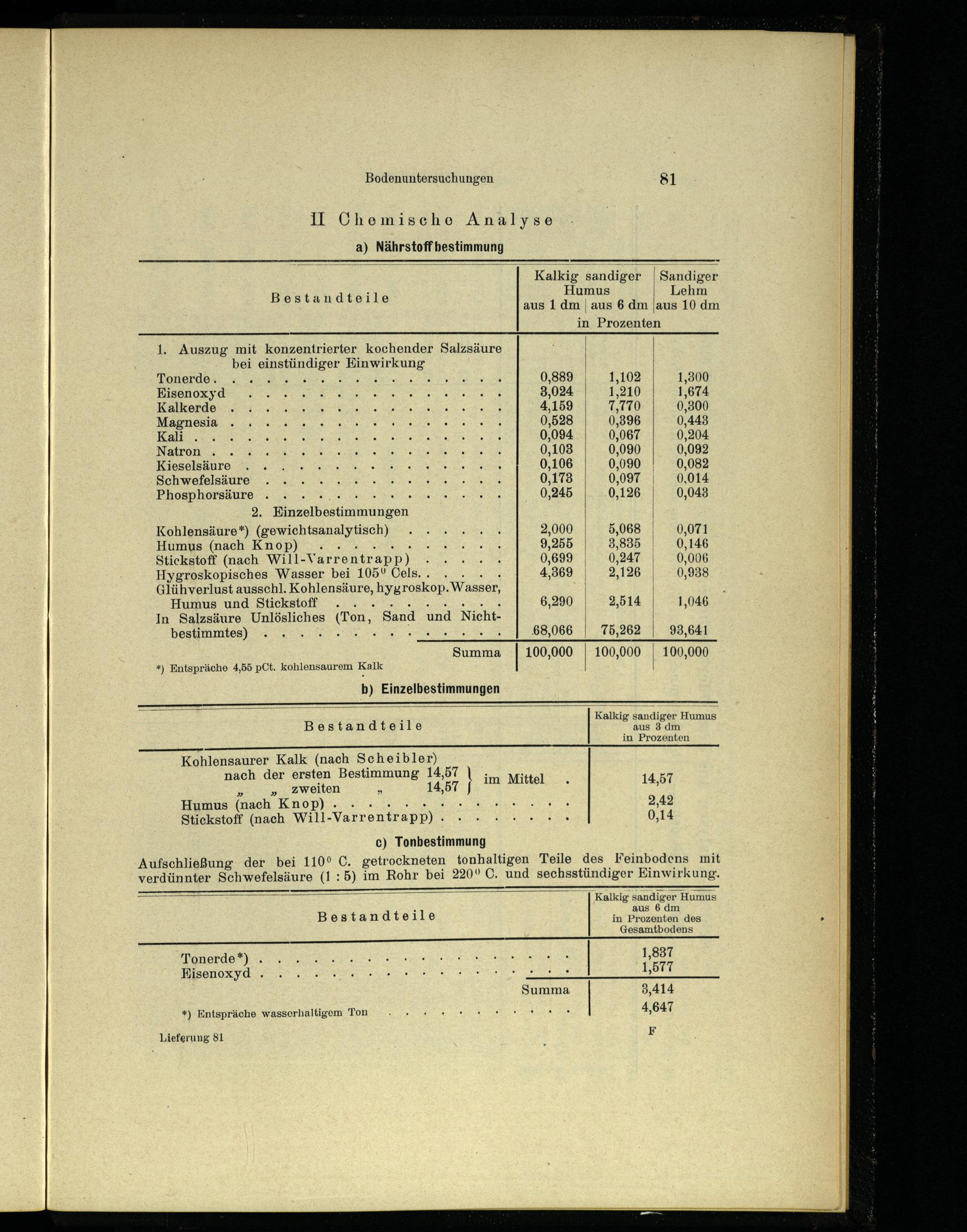 1. Auszug mit konzentrierter kochender Salzsäure bei einstündiger Einwirkung Tonerde: z 0... 40 At ee 41102 1,300 Eisenoxyd. 0.04 RENNER 1,210 1,674 Kalkerde.. 2. U 7,770 0,300 Magnesiga. 0 N 0,396 0,443 Kal 0,067 0,204 Natron 2. 0 te en nei 0,090| 0,092 Kieselsäure 1 Det 0,090 0,082 Schwefelsiure 2. 0,097 0,014 Phosphorsäure.;. x... la 1...=0,126: 1 0,048 2. Einzelbestimmungen|